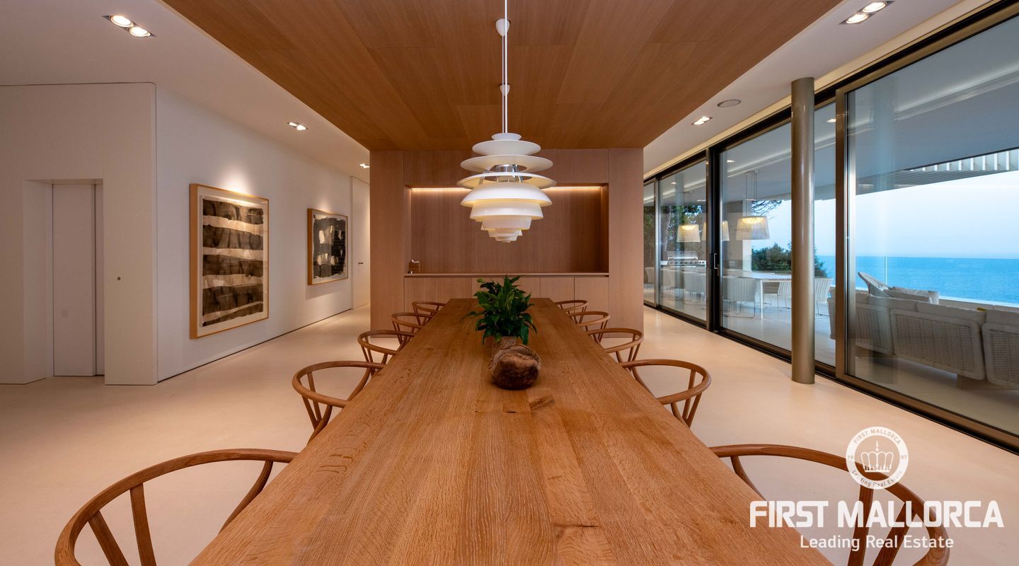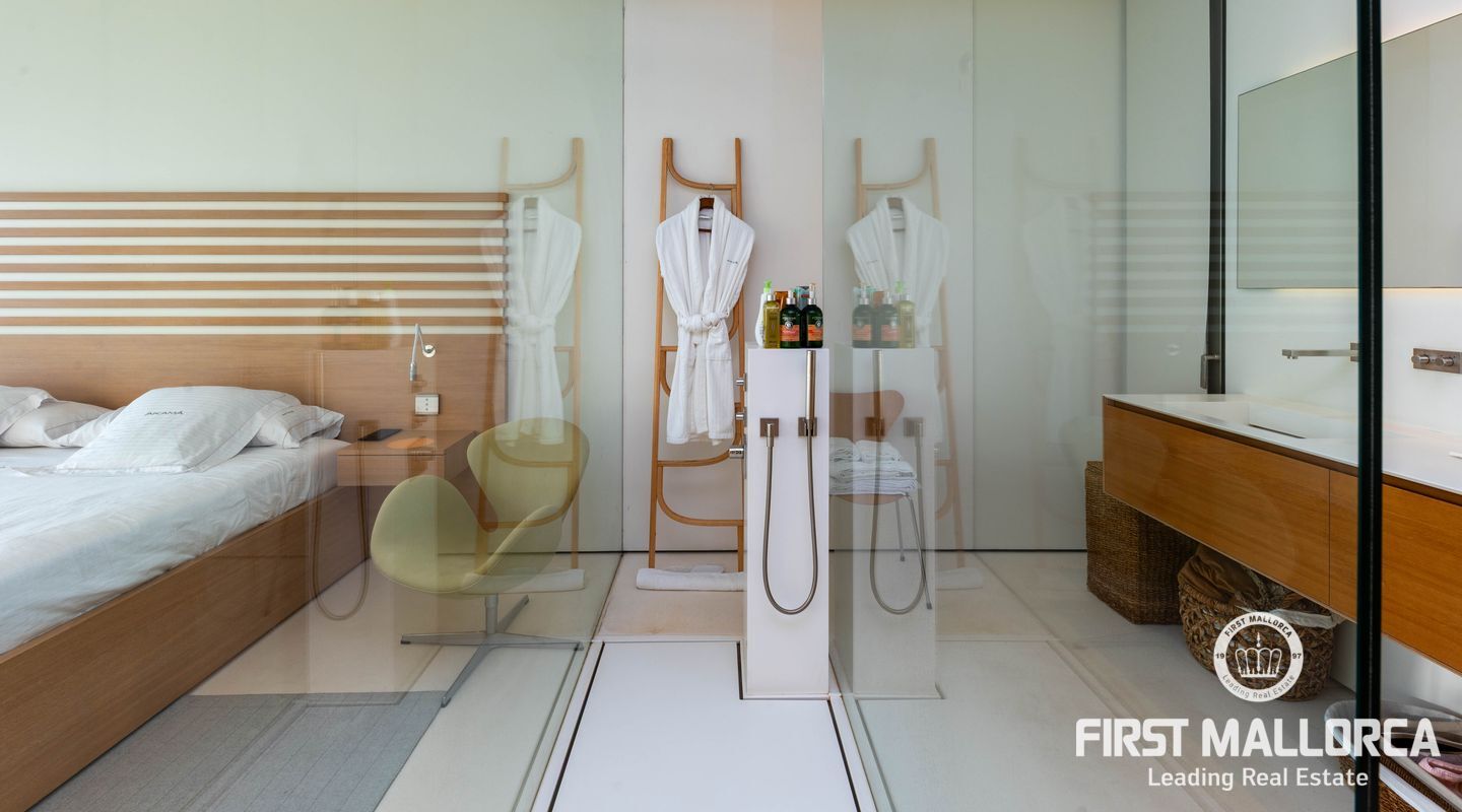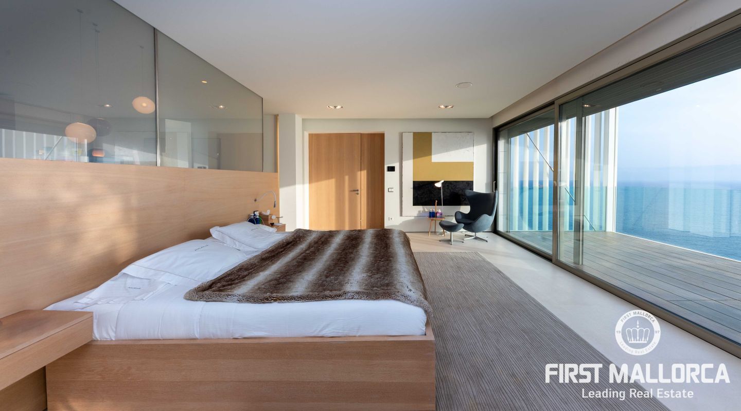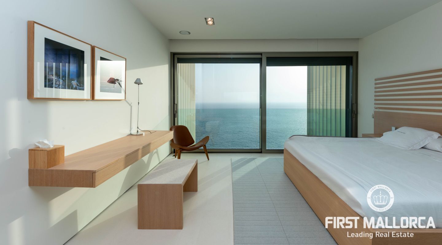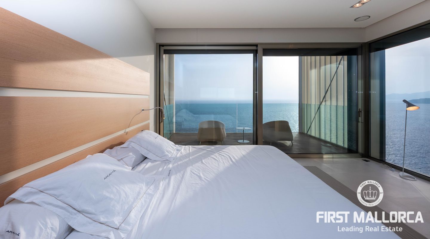 Det som verkligen särskiljer denna fastighet är dess privata tillgång till havet – en sällsynt förmån på Mallorca. Den samtida och tidlösa designen kombinerar vit betong, varm kalksten och elegant ekträ. De generösa fönstren från golv till tak skapar en sömlös övergång mellan inomhus- och utomhusmiljö.