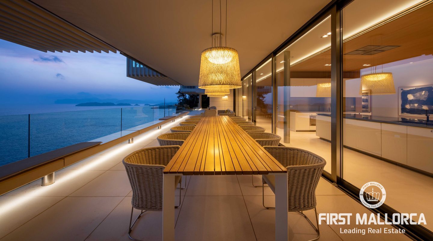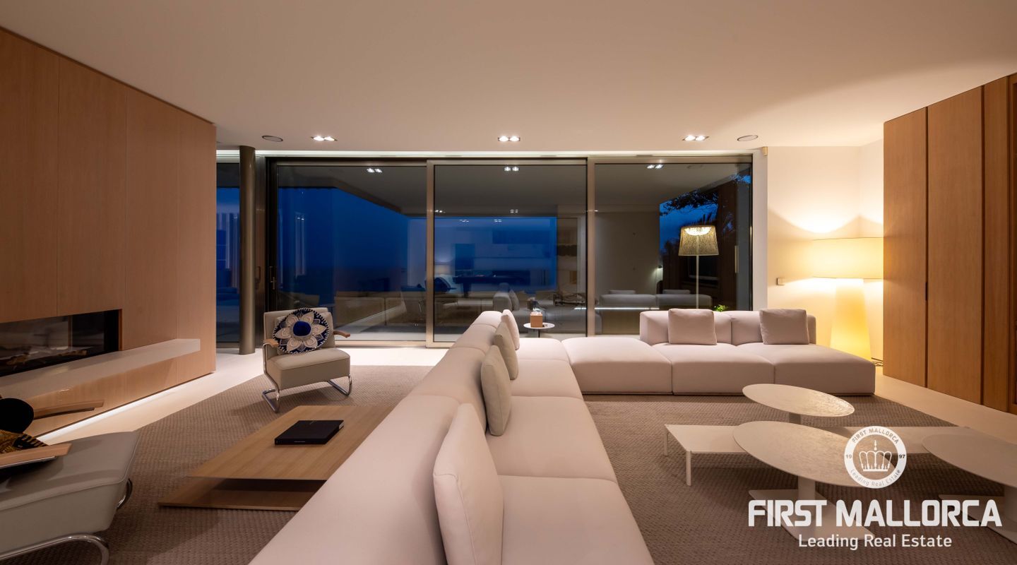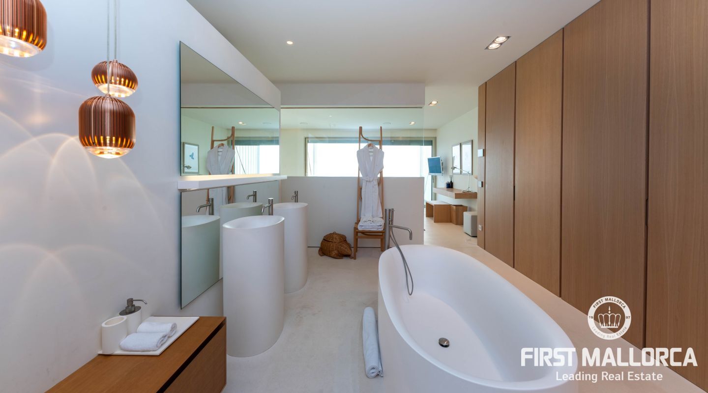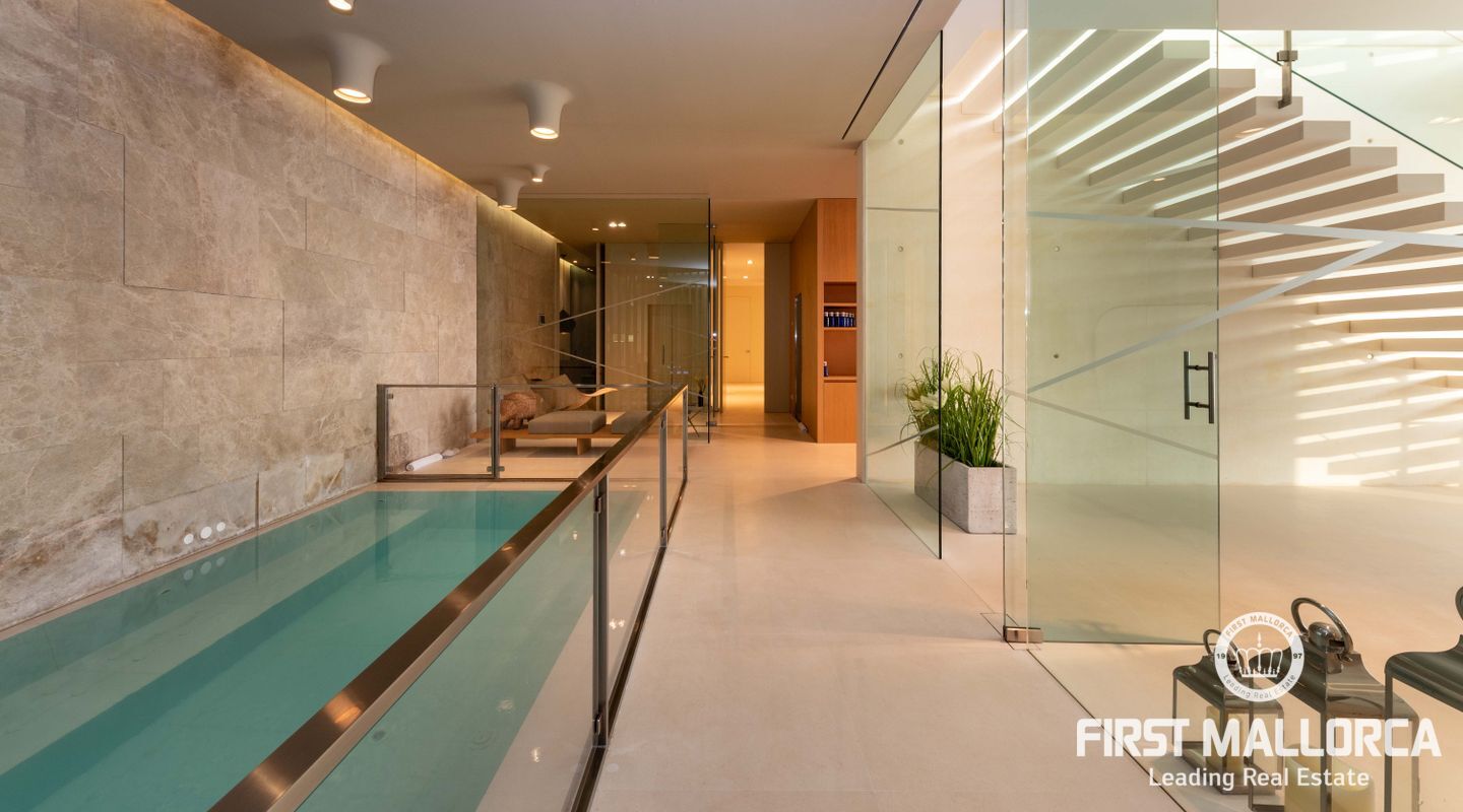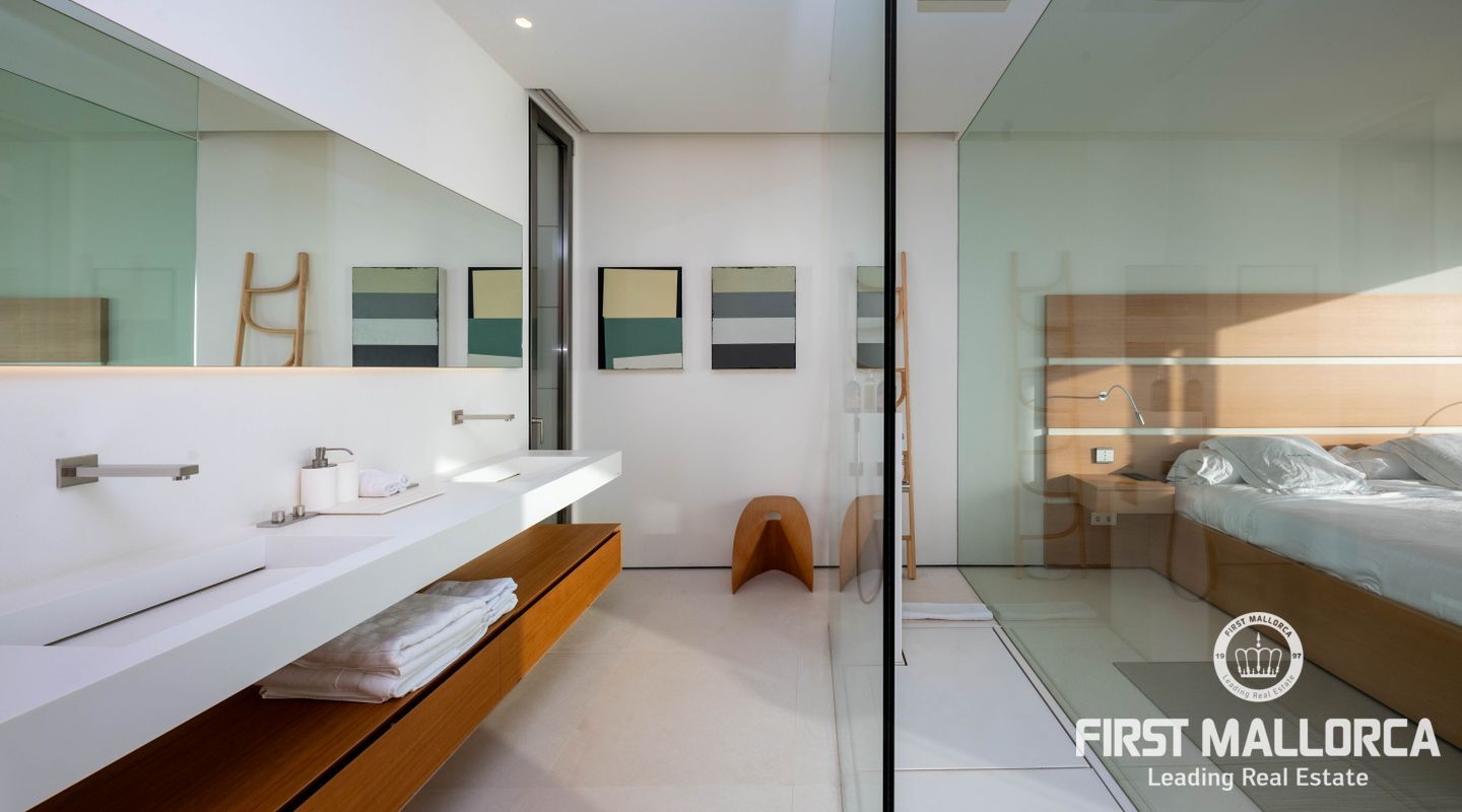 Det som verkligen särskiljer denna fastighet är dess privata tillgång till havet – en sällsynt förmån på Mallorca. Den samtida och tidlösa designen kombinerar vit betong, varm kalksten och elegant ekträ. De generösa fönstren från golv till tak skapar en sömlös övergång mellan inomhus- och utomhusmiljö.