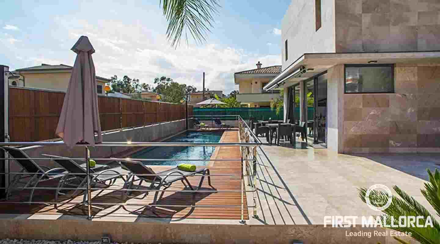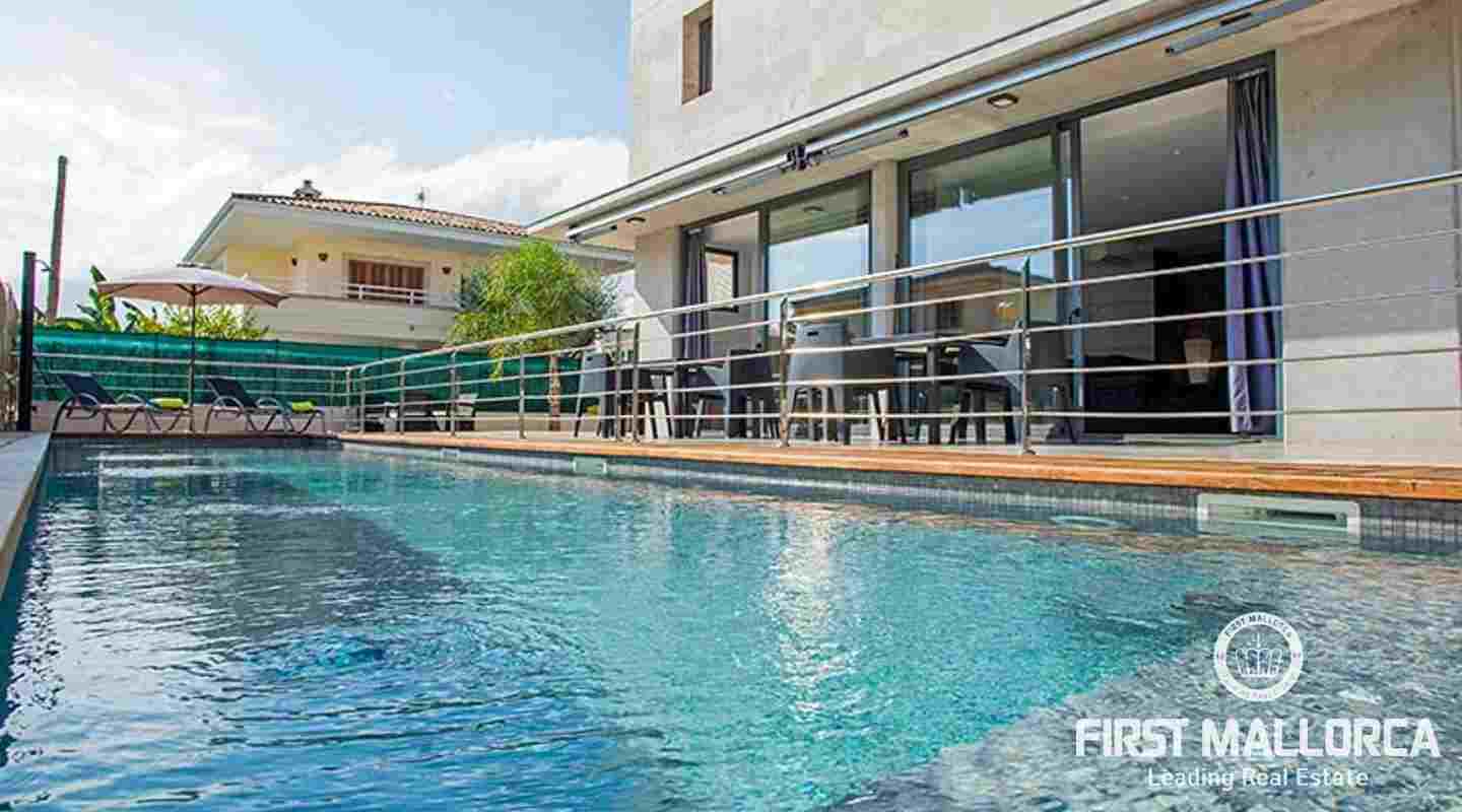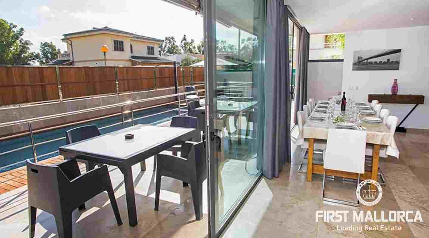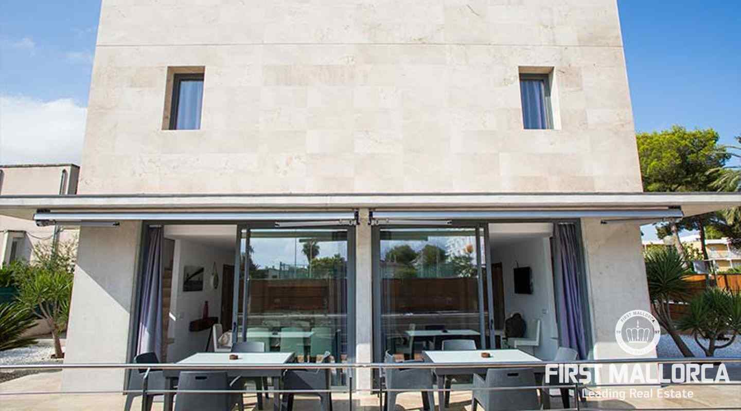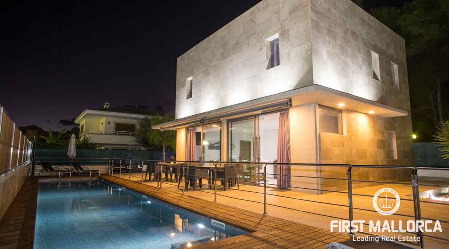 Denna minimalistiska villa i modern stil ligger bara några meter från den populära sandstranden Playa de Muro på norra Mallorca. Totalt sex sovrum, fyra badrum, ett ljust vardagsrum/matsal och ett fullt utrustat kök är en del av utrymmet som erbjuds. Alla rum är utrustade med luftkonditionering varm/kall. Från vardagsrummet kommer du in i den vackra trädgården. Denna har en pool med omgivande solterrass, en egen lekplats och ytterligare terrassutrymme för att njuta av medelhavslivsstilen med familj och vänner. Dessutom erbjuder fastigheten en privat parkeringsplats för upp till tre bilar. Stranden med sitt kristallklara vatten kan nås på några minuter till fots. Ett urval av kaféer och restauranger, shoppingmöjligheter och andra bekvämligheter för dagliga behov finns också inom gångavstånd. På grund av det utmärkta läget passar fastigheten utmärkt som semesterboende och kan även användas som investering tack vare den redan befintliga licensen för semesteruthyrning för 12 personer.