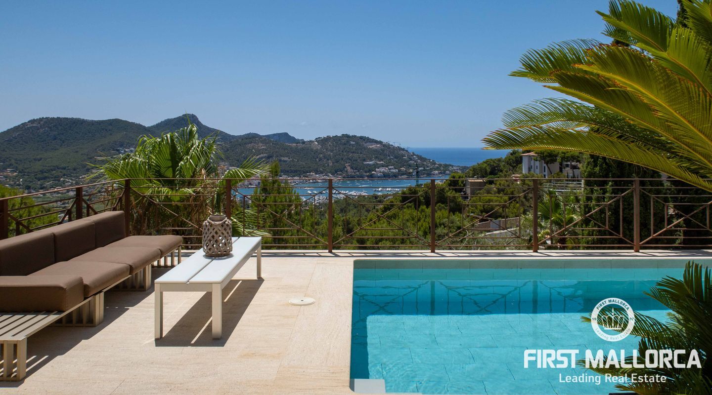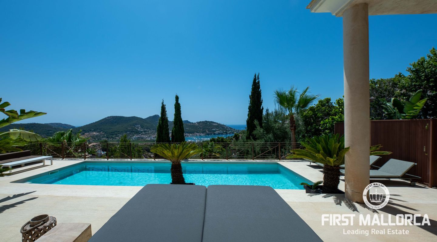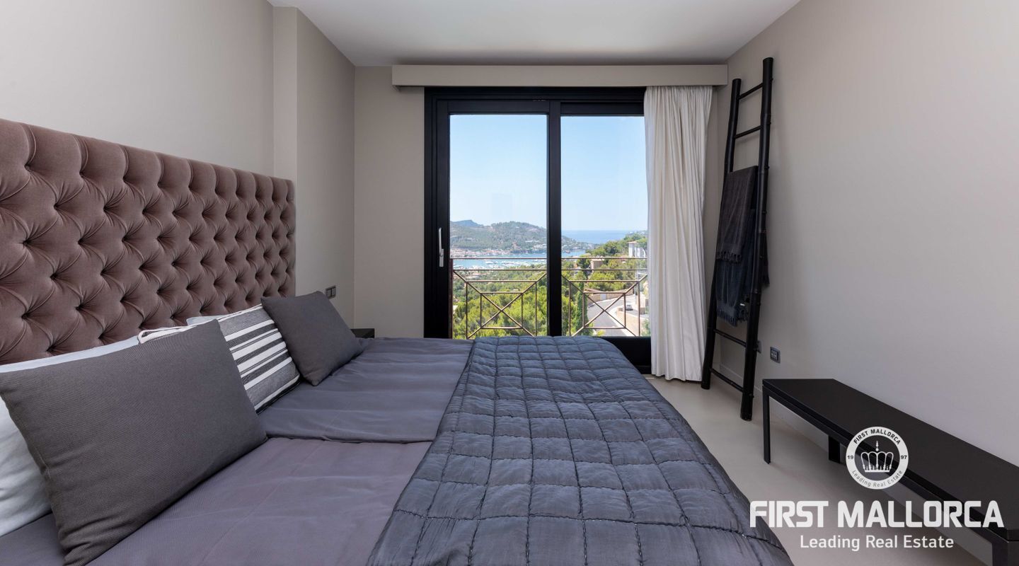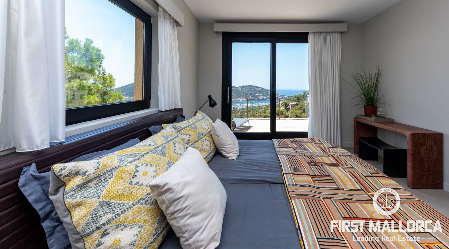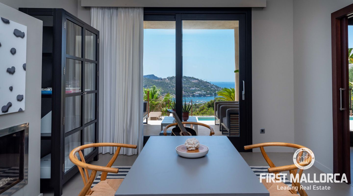 Rymligt, avkopplande hus med havsutsikt i Puerto de Andratx. Fönster från golv till tak ger sol och ljus i huset, med fantastisk utsikt över hamnen. På övervåningen hittar du 2 rymliga sovrum i master suite storlek och 2 ytterligare sovrum - alla med egna badrum. 2 av sovrummen har egna privata terrasser med havsutsikt. Det finns en oberoende och privat gäststudio med pentry och badrum. Snookerrum och en vinkällare. Ytterligare funktioner inkluderar öppen spis, golvvärme, AC varm/kall, garage, larm, satellit-TV.