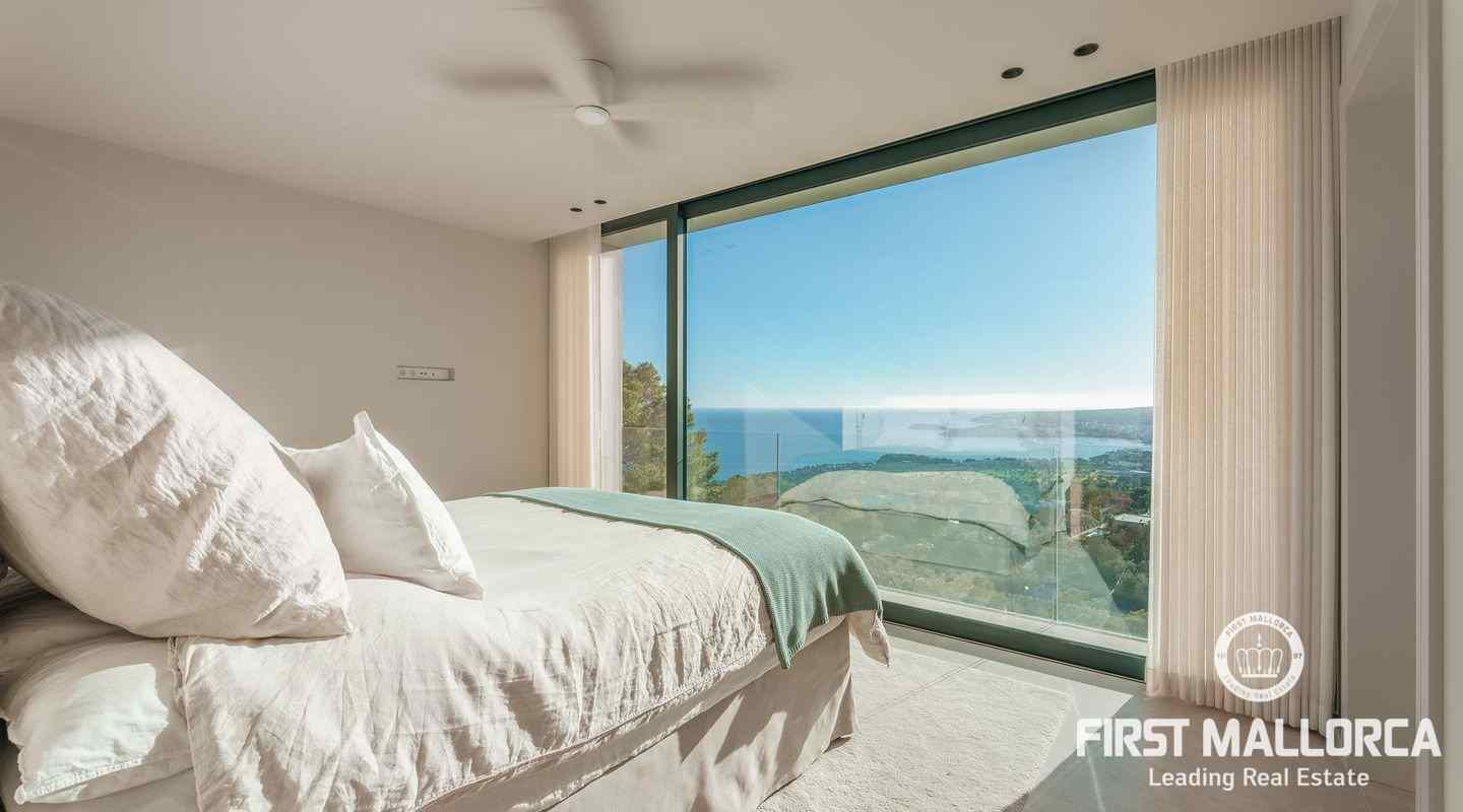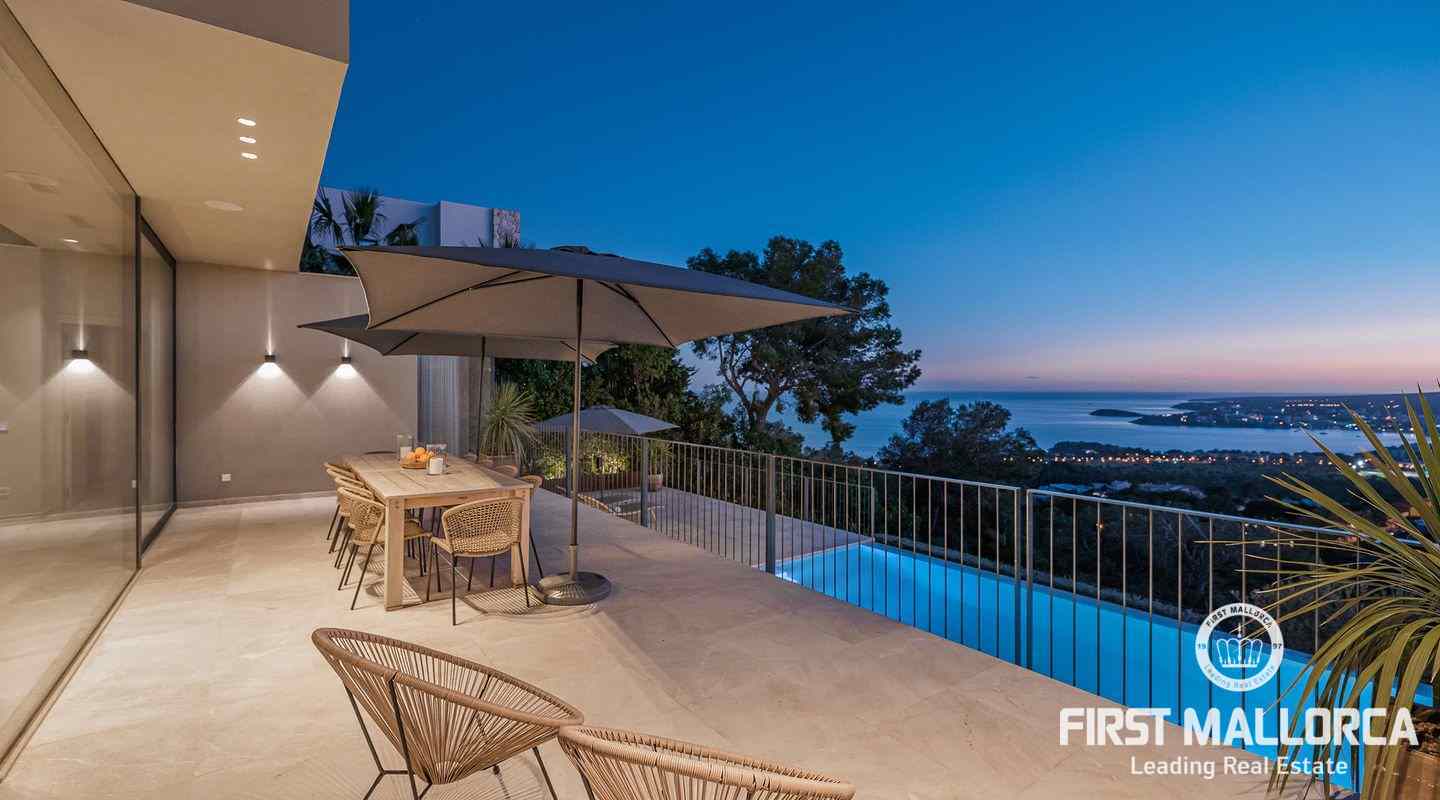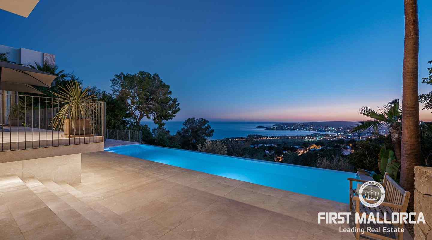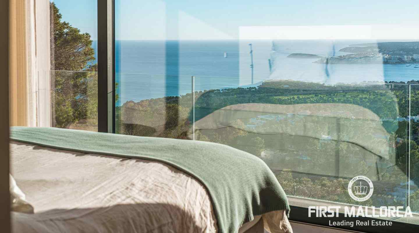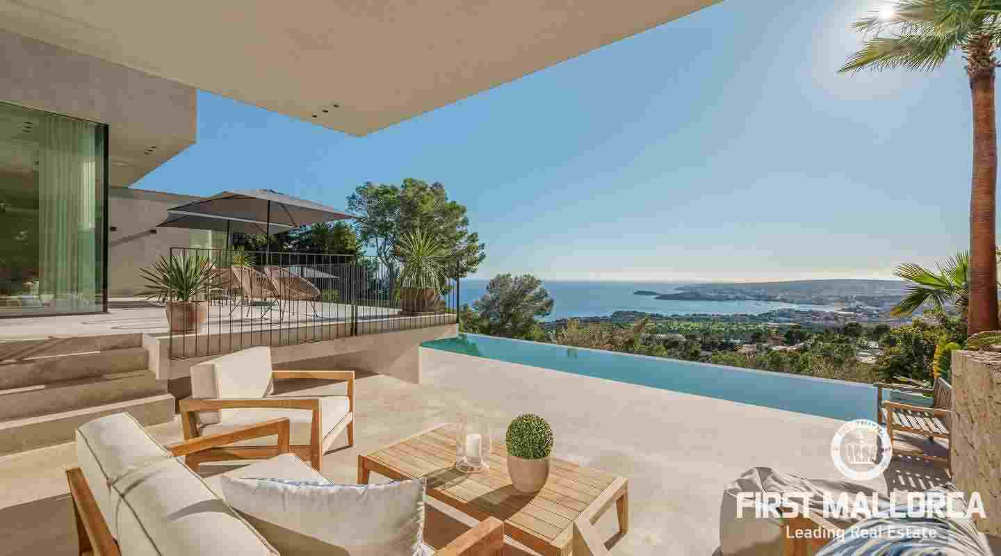 Denna moderna designvilla ligger i bergen i Costa d'en Blanes ovanför Puerto Portals. Den ädla nybyggnaden erbjuder en spektakulär utsikt över landskapet, sydvästkusten och det öppna havet. Det finns 5 sovrum och 4 badrum, ett rymligt och öppet vardagsrum/matsal och en spa-avdelning med fitnessrum och ångbastu. Den sensationella och oöverblickbara havsutsikten kan avnjutas från alla inomhus- och utomhusområden. Andra funktioner ingår: Hiss, hemautomationssystem, golvvärme, luftkonditionering varm / kall, öppen spis och en täckt parkeringsplats för 4 bilar. Costa d'en Blanes är ett lugnt bostadsområde, bara några minuter från den exklusiva småbåtshamnen Puerto Portals. Området erbjuder 24-timmars bevakning, olika tennisbanor, privat parkering och tillgång till stranden Costa d'en Blanes. Palmas centrum nås på bara 10 minuter och den internationella flygplatsen på mindre än 20 minuter med bil. Det finns flera internationella privatskolor och golfbanor i omedelbar närhet.