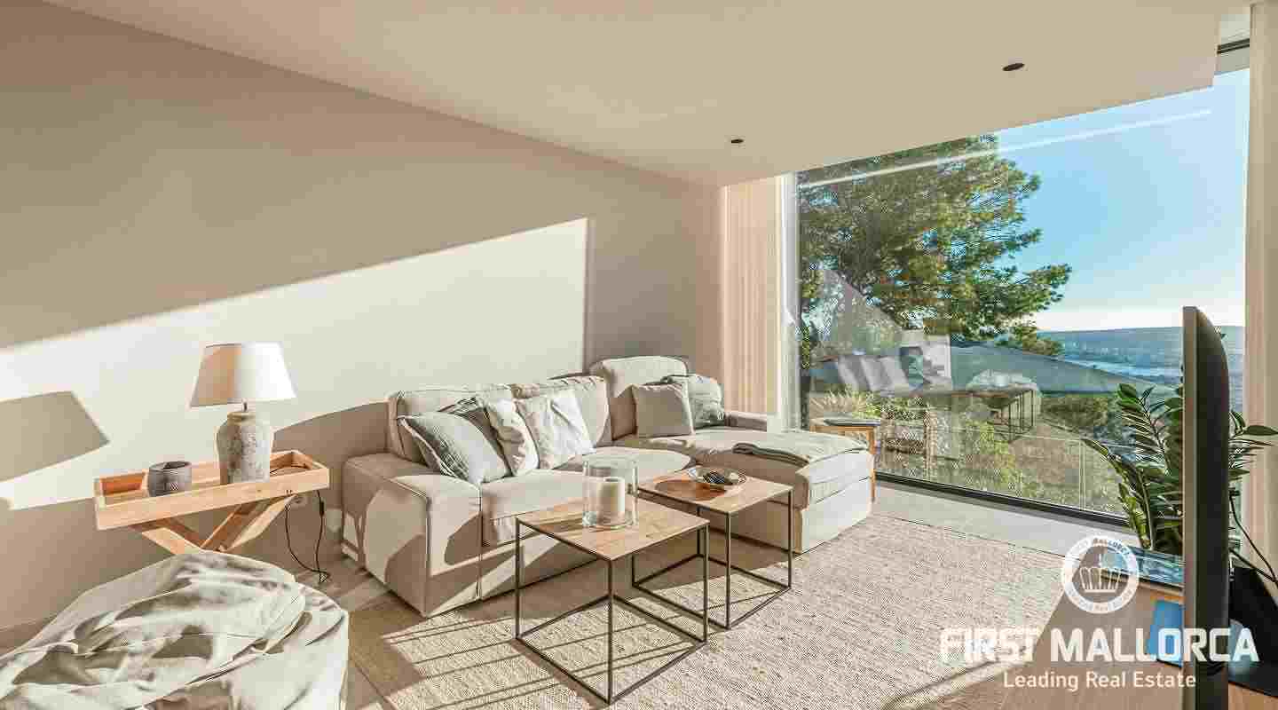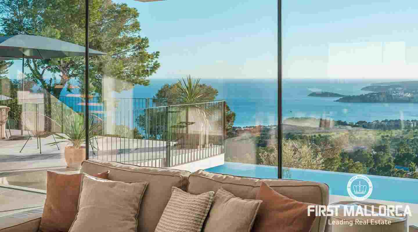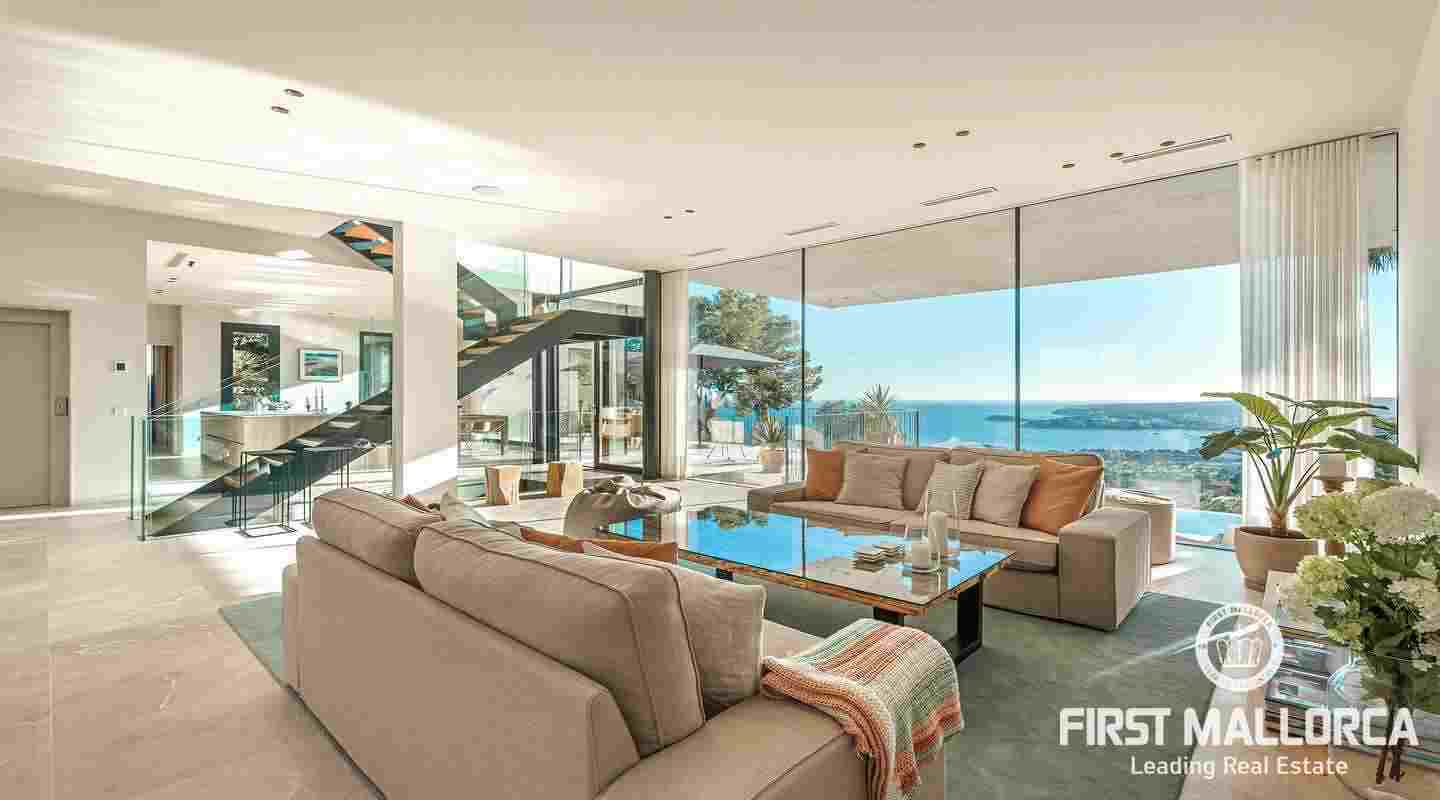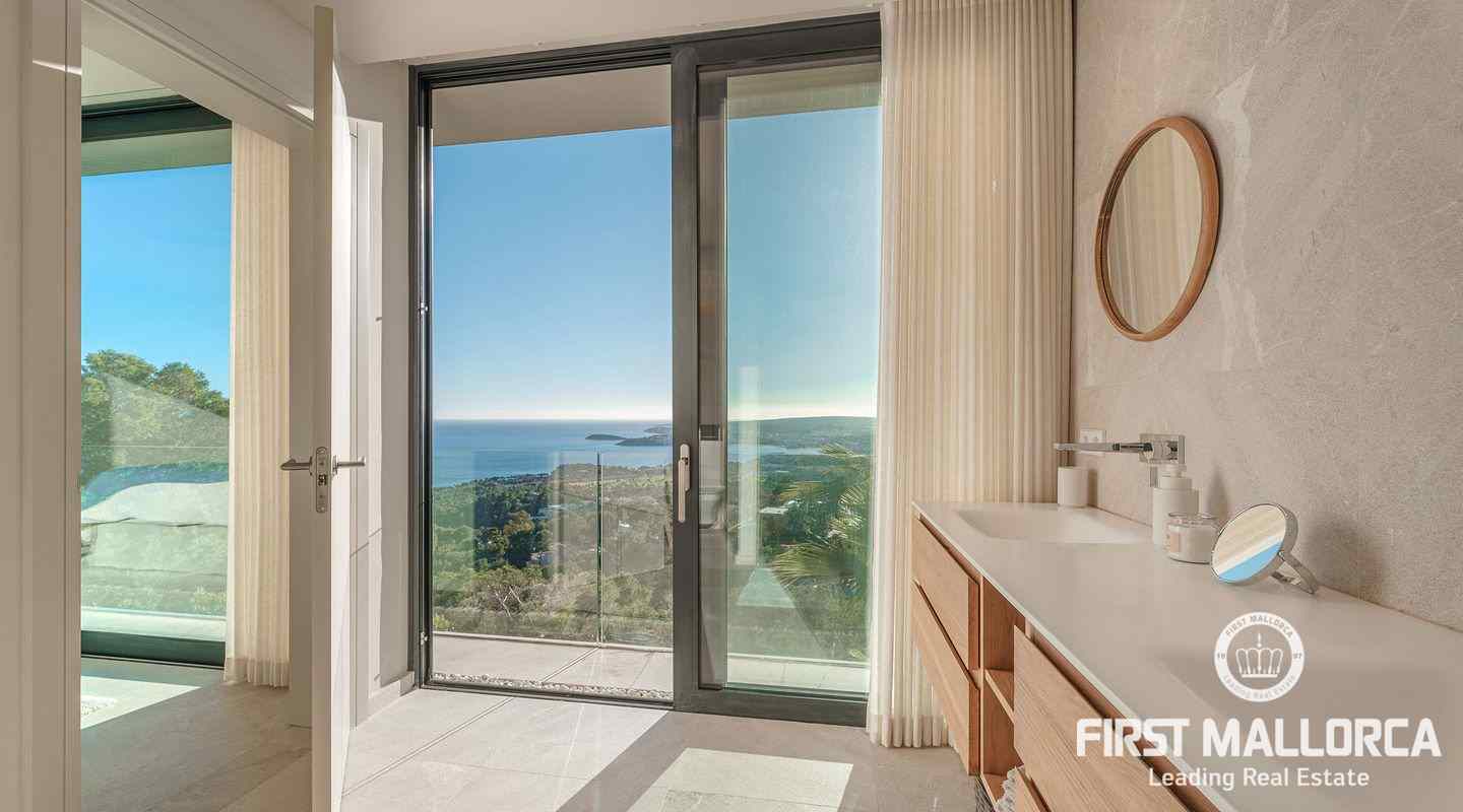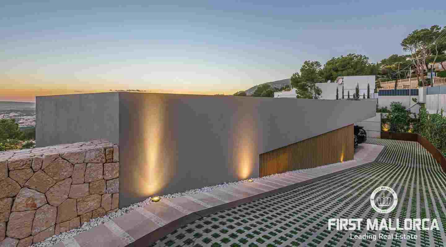 Denna moderna designvilla ligger i bergen i Costa d'en Blanes ovanför Puerto Portals. Den ädla nybyggnaden erbjuder en spektakulär utsikt över landskapet, sydvästkusten och det öppna havet. Det finns 5 sovrum och 4 badrum, ett rymligt och öppet vardagsrum/matsal och en spa-avdelning med fitnessrum och ångbastu. Den sensationella och oöverblickbara havsutsikten kan avnjutas från alla inomhus- och utomhusområden. Andra funktioner ingår: Hiss, hemautomationssystem, golvvärme, luftkonditionering varm / kall, öppen spis och en täckt parkeringsplats för 4 bilar. Costa d'en Blanes är ett lugnt bostadsområde, bara några minuter från den exklusiva småbåtshamnen Puerto Portals. Området erbjuder 24-timmars bevakning, olika tennisbanor, privat parkering och tillgång till stranden Costa d'en Blanes. Palmas centrum nås på bara 10 minuter och den internationella flygplatsen på mindre än 20 minuter med bil. Det finns flera internationella privatskolor och golfbanor i omedelbar närhet.