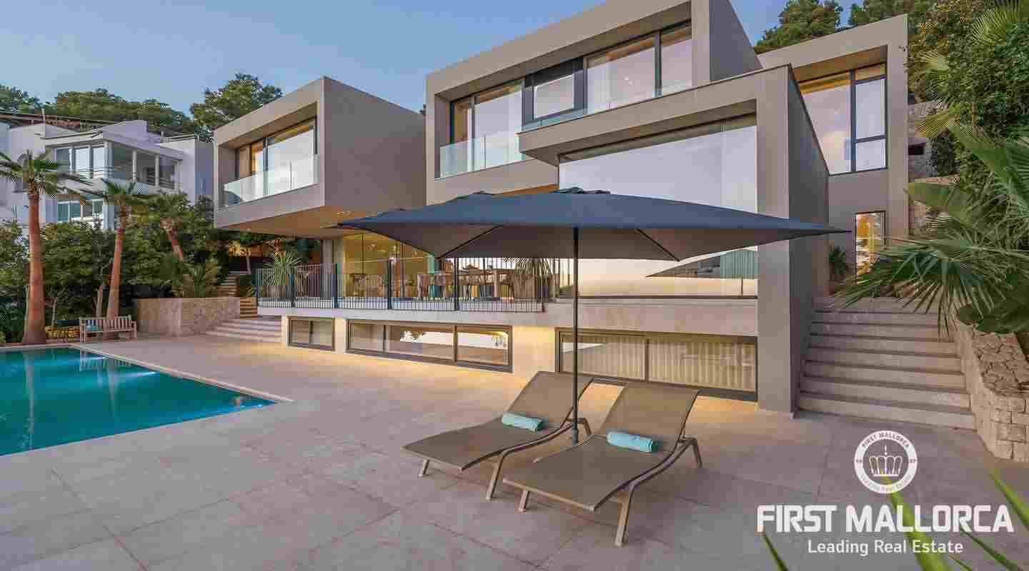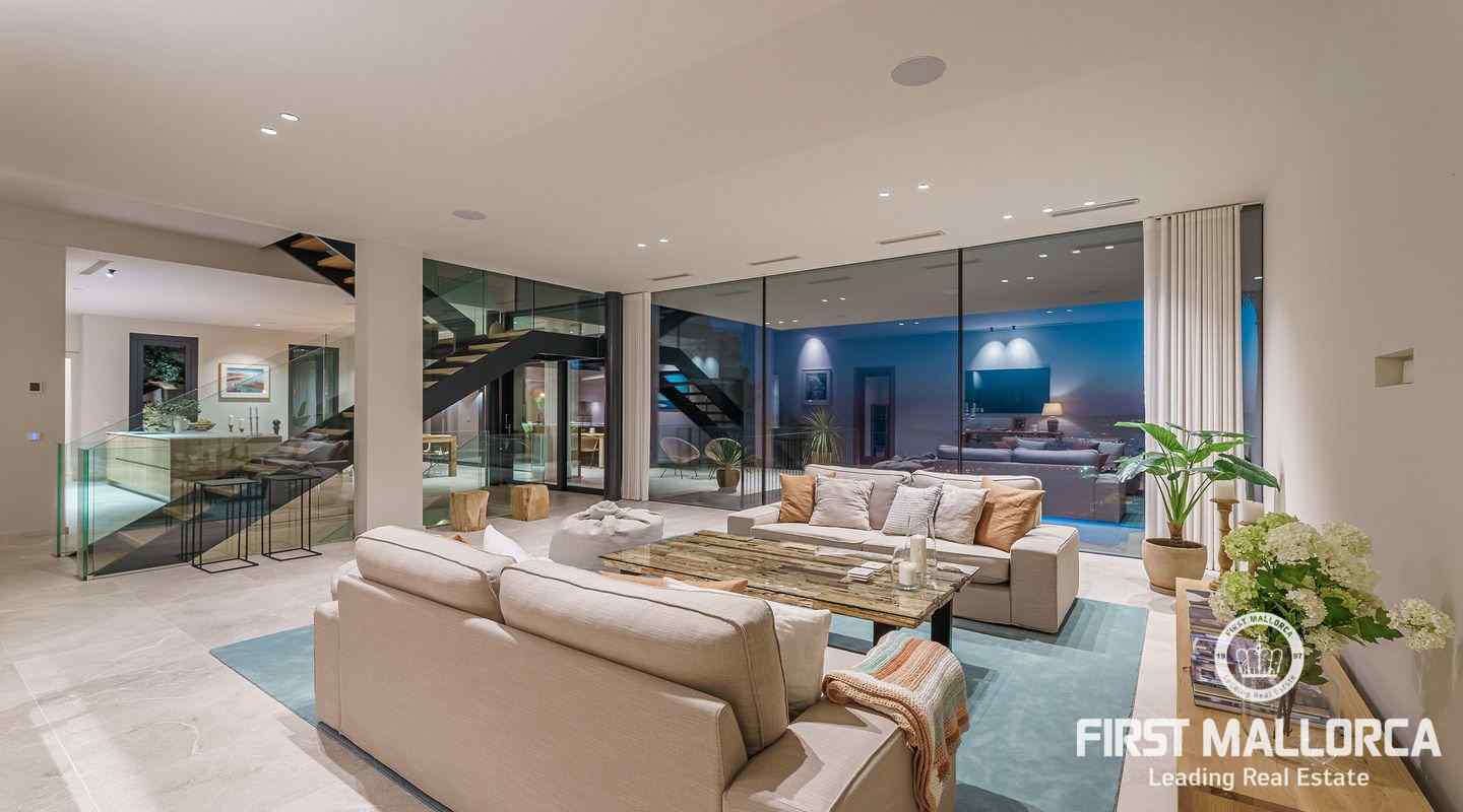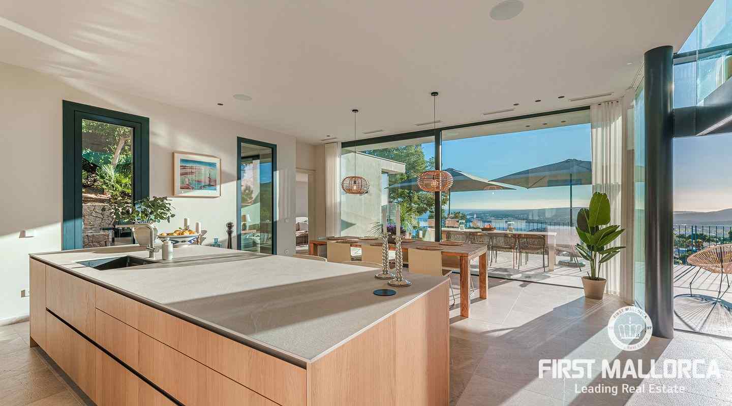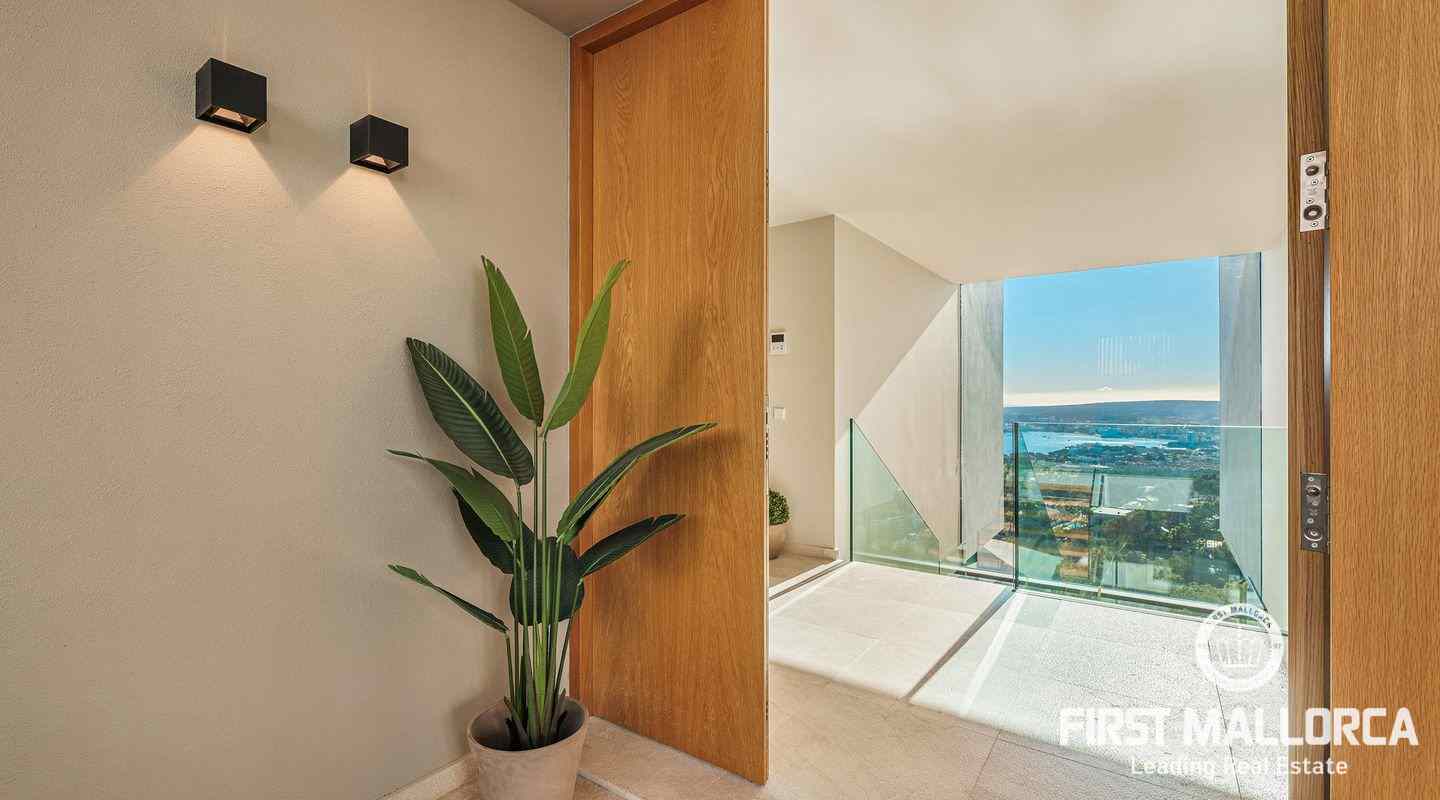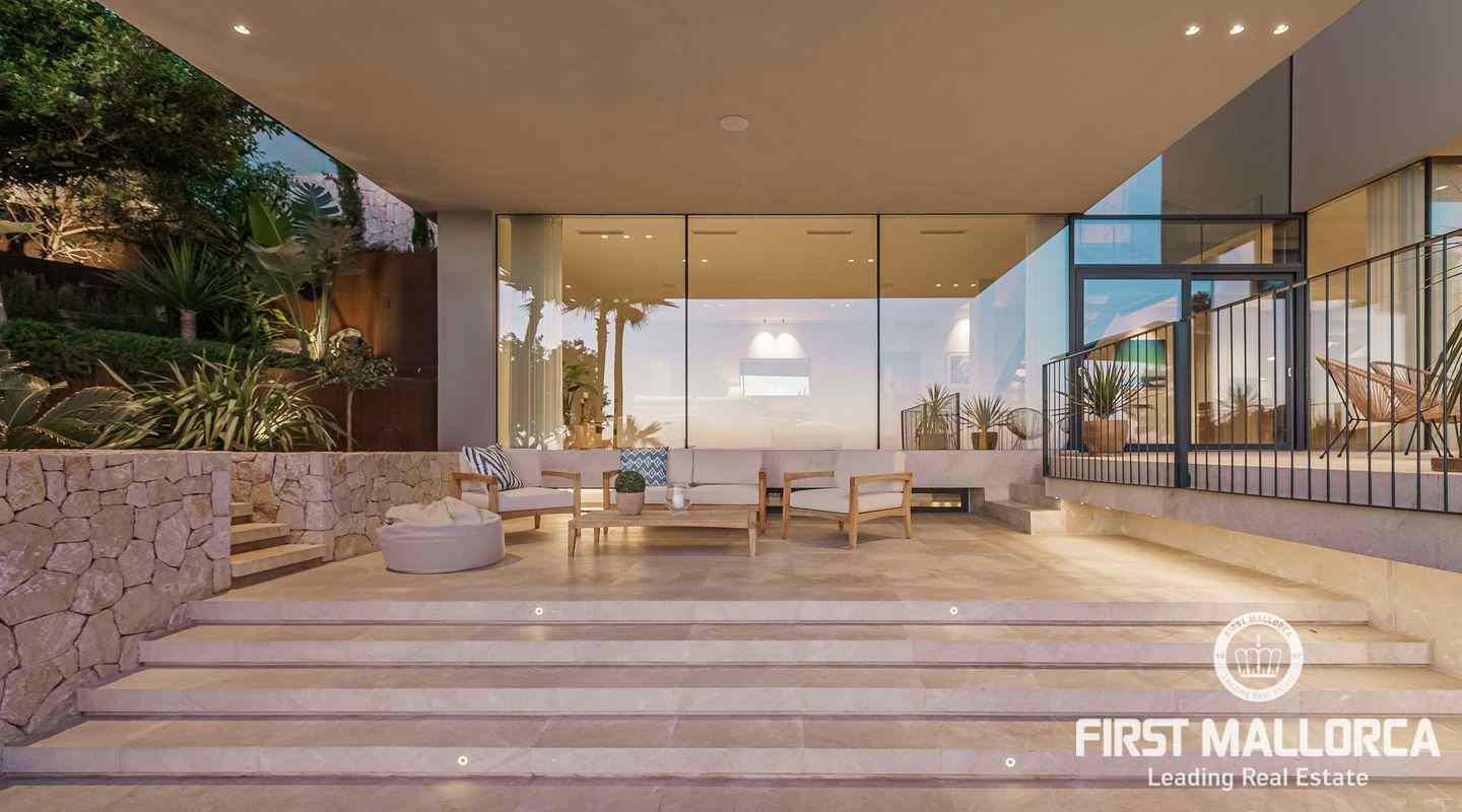 Denna moderna designvilla ligger i bergen i Costa d'en Blanes ovanför Puerto Portals. Den ädla nybyggnaden erbjuder en spektakulär utsikt över landskapet, sydvästkusten och det öppna havet. Det finns 5 sovrum och 4 badrum, ett rymligt och öppet vardagsrum/matsal och en spa-avdelning med fitnessrum och ångbastu. Den sensationella och oöverblickbara havsutsikten kan avnjutas från alla inomhus- och utomhusområden. Andra funktioner ingår: Hiss, hemautomationssystem, golvvärme, luftkonditionering varm / kall, öppen spis och en täckt parkeringsplats för 4 bilar. Costa d'en Blanes är ett lugnt bostadsområde, bara några minuter från den exklusiva småbåtshamnen Puerto Portals. Området erbjuder 24-timmars bevakning, olika tennisbanor, privat parkering och tillgång till stranden Costa d'en Blanes. Palmas centrum nås på bara 10 minuter och den internationella flygplatsen på mindre än 20 minuter med bil. Det finns flera internationella privatskolor och golfbanor i omedelbar närhet.