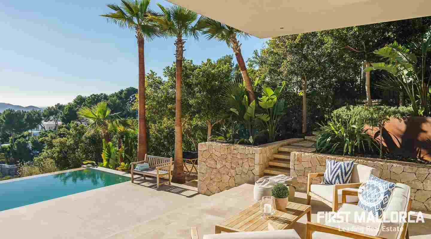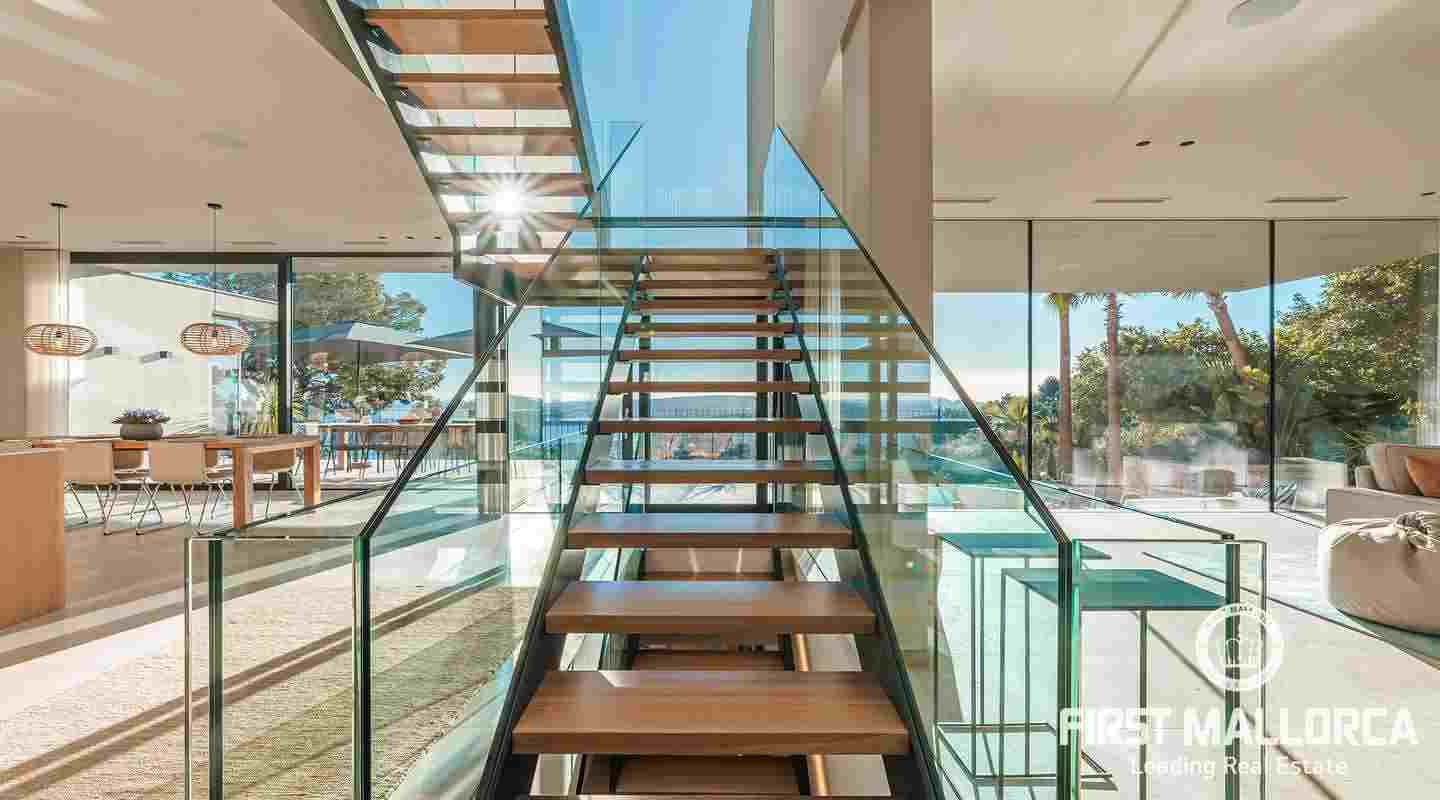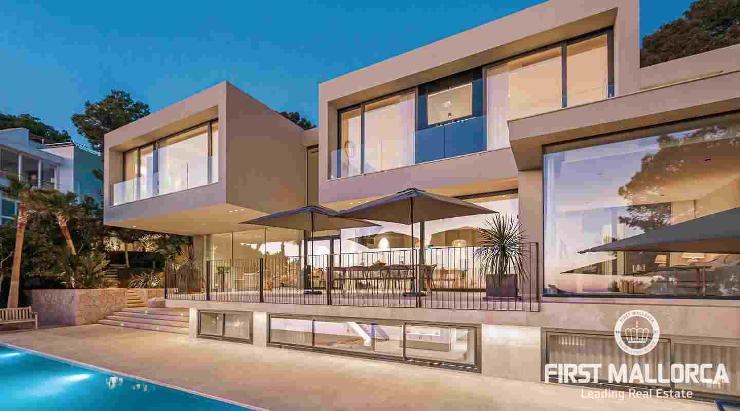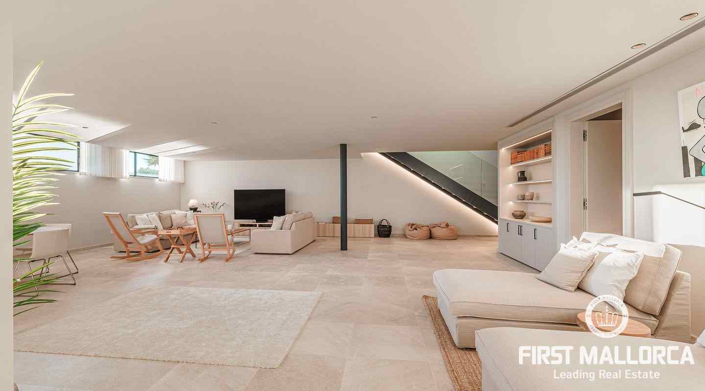 Denna moderna designvilla ligger i bergen i Costa d'en Blanes ovanför Puerto Portals. Den ädla nybyggnaden erbjuder en spektakulär utsikt över landskapet, sydvästkusten och det öppna havet. Det finns 5 sovrum och 4 badrum, ett rymligt och öppet vardagsrum/matsal och en spa-avdelning med fitnessrum och ångbastu. Den sensationella och oöverblickbara havsutsikten kan avnjutas från alla inomhus- och utomhusområden. Andra funktioner ingår: Hiss, hemautomationssystem, golvvärme, luftkonditionering varm / kall, öppen spis och en täckt parkeringsplats för 4 bilar. Costa d'en Blanes är ett lugnt bostadsområde, bara några minuter från den exklusiva småbåtshamnen Puerto Portals. Området erbjuder 24-timmars bevakning, olika tennisbanor, privat parkering och tillgång till stranden Costa d'en Blanes. Palmas centrum nås på bara 10 minuter och den internationella flygplatsen på mindre än 20 minuter med bil. Det finns flera internationella privatskolor och golfbanor i omedelbar närhet.