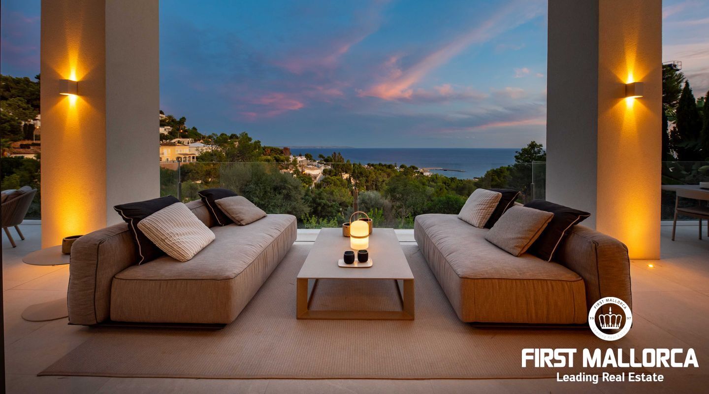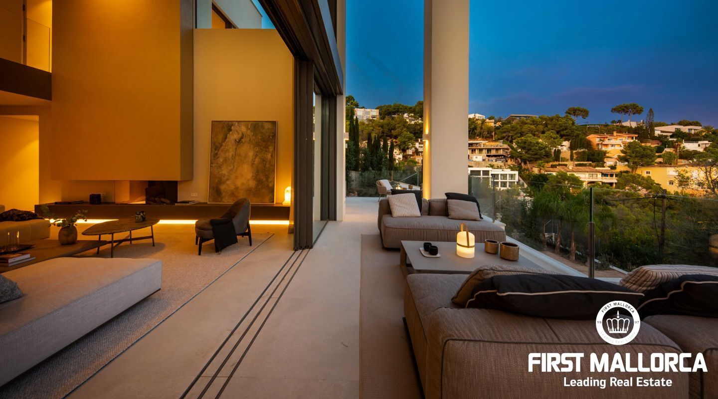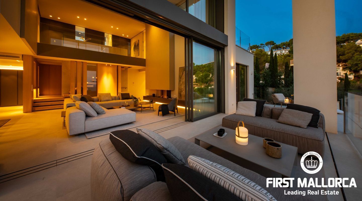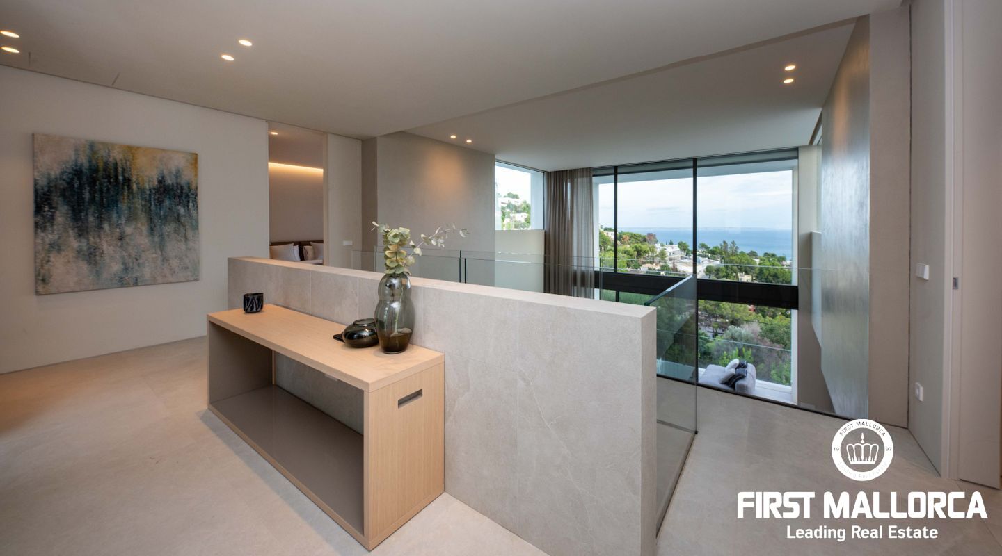 Denna moderna villa med havsutsikt ligger ovanför den lyxiga hamnen i Puerto Portals. Den har totalt 5 sovrum och 5 en-suite badrum och ett walk-in dressing room i det stora sovrummet. Bostadsytan är uppdelad på tre nivåer. På den övre nivån finns huvudentrén med 2 gästrum, fullt utrustade badrum med eget badrum. Hissen leder härifrån till den lägsta våningen. På mellannivån finns huvudköket med rymlig matsal, ett av vardagsrummen med öppen spis och gästtoalett. På nedre plan finns ett annat vardagsrum med direkt tillgång till poolen och ytterligare två gästrum med eget badrum. Ett rymligt loungeområde vid poolen med ett fullt utrustat utomhuskök avrundar Medelhavsstämningen perfekt. Från alla rum och terrasser har man en fantastisk utsikt över Medelhavet. Utrustningen inkluderar Poliform-garderober, ett Poliform-kök, Minotti-möbler, central luftkonditionering och golvvärme i hela huset. Sammanfattningsvis; det perfekta hemmet på Mallorca! Costa den Blanes är ett av de mest exklusiva bostadsområdena på sydvästra Mallorca. Omgivet av Puerto Portals marina, vackra sandstränder och internationella skolor, kan man njuta av Medelhavsklimatet här året runt i lugn och ro. Både öns huvudstad Palma ligger bara 15 minuter bort och flygplatsen kan nås på 25 minuter med bil.