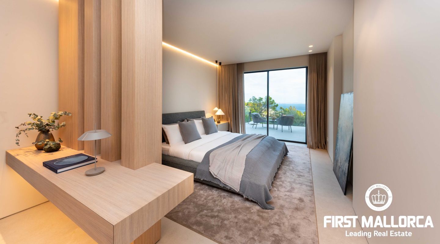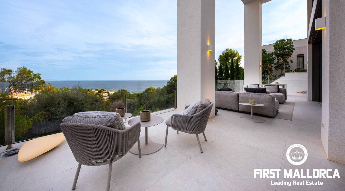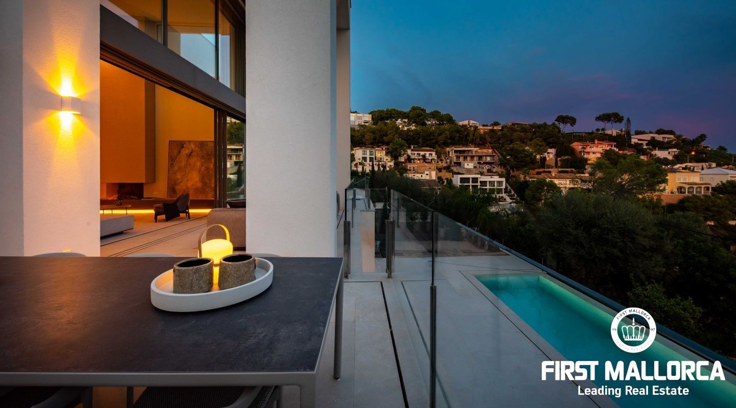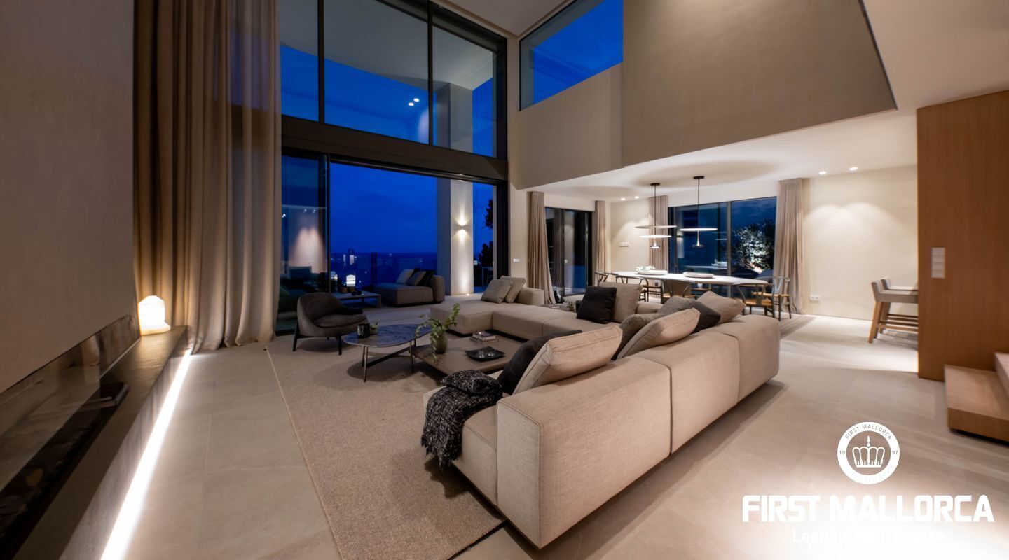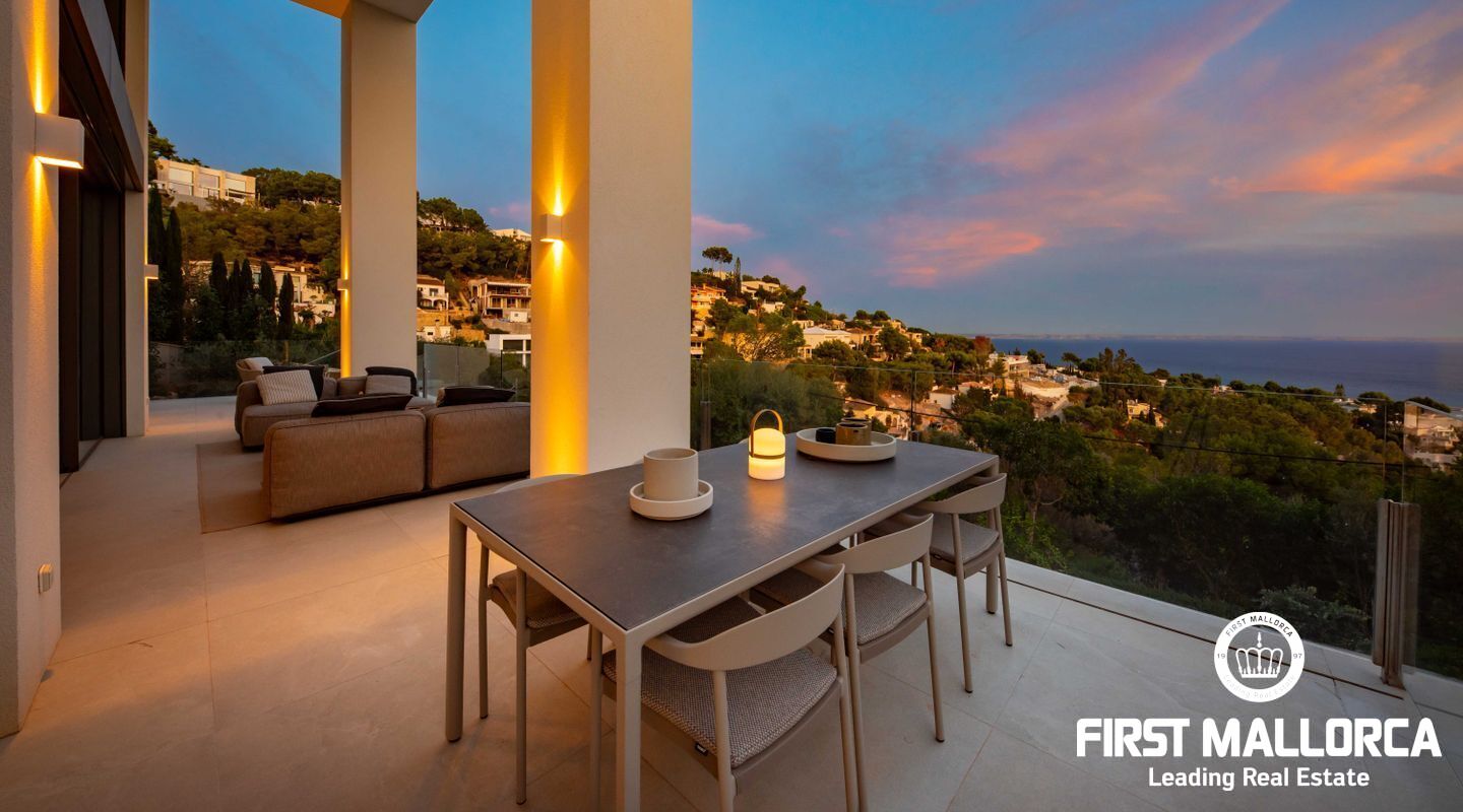 Denna moderna villa med havsutsikt ligger ovanför den lyxiga hamnen i Puerto Portals. Den har totalt 5 sovrum och 5 en-suite badrum och ett walk-in dressing room i det stora sovrummet. Bostadsytan är uppdelad på tre nivåer. På den övre nivån finns huvudentrén med 2 gästrum, fullt utrustade badrum med eget badrum. Hissen leder härifrån till den lägsta våningen. På mellannivån finns huvudköket med rymlig matsal, ett av vardagsrummen med öppen spis och gästtoalett. På nedre plan finns ett annat vardagsrum med direkt tillgång till poolen och ytterligare två gästrum med eget badrum. Ett rymligt loungeområde vid poolen med ett fullt utrustat utomhuskök avrundar Medelhavsstämningen perfekt. Från alla rum och terrasser har man en fantastisk utsikt över Medelhavet. Utrustningen inkluderar Poliform-garderober, ett Poliform-kök, Minotti-möbler, central luftkonditionering och golvvärme i hela huset. Sammanfattningsvis; det perfekta hemmet på Mallorca! Costa den Blanes är ett av de mest exklusiva bostadsområdena på sydvästra Mallorca. Omgivet av Puerto Portals marina, vackra sandstränder och internationella skolor, kan man njuta av Medelhavsklimatet här året runt i lugn och ro. Både öns huvudstad Palma ligger bara 15 minuter bort och flygplatsen kan nås på 25 minuter med bil.