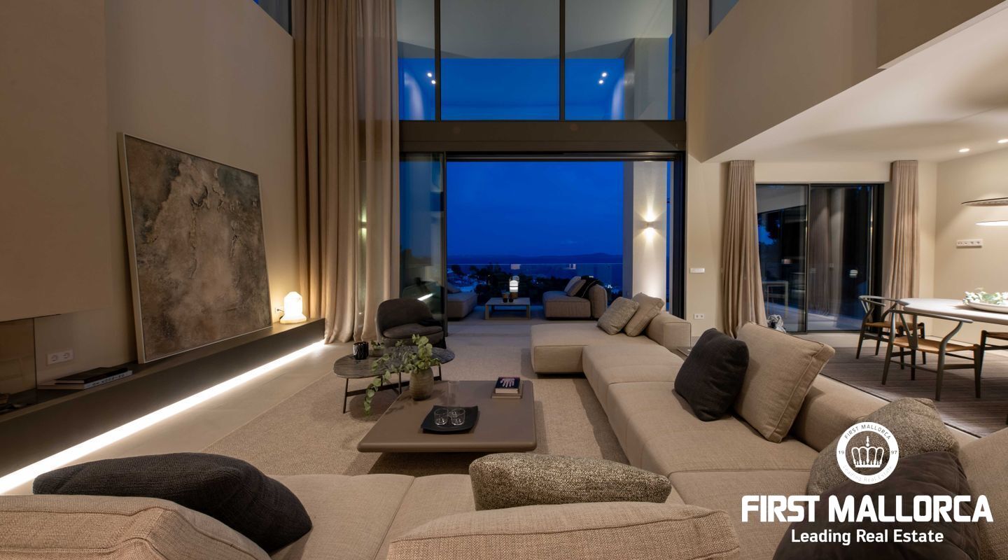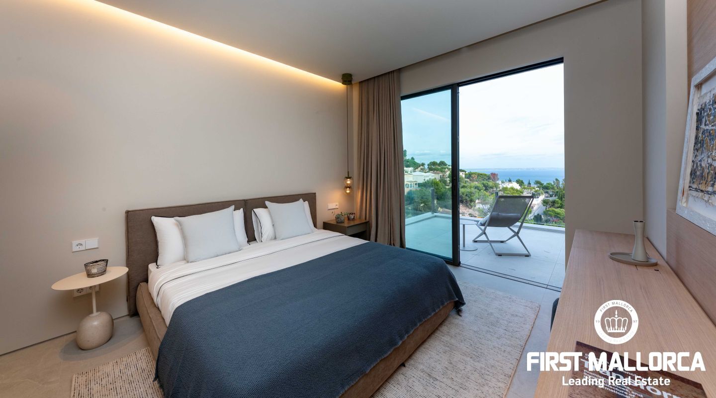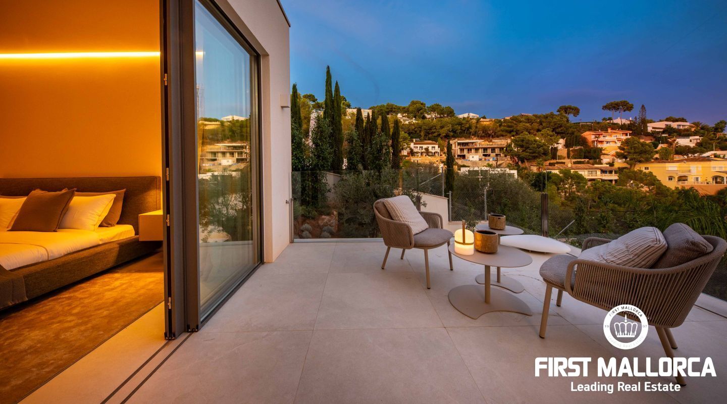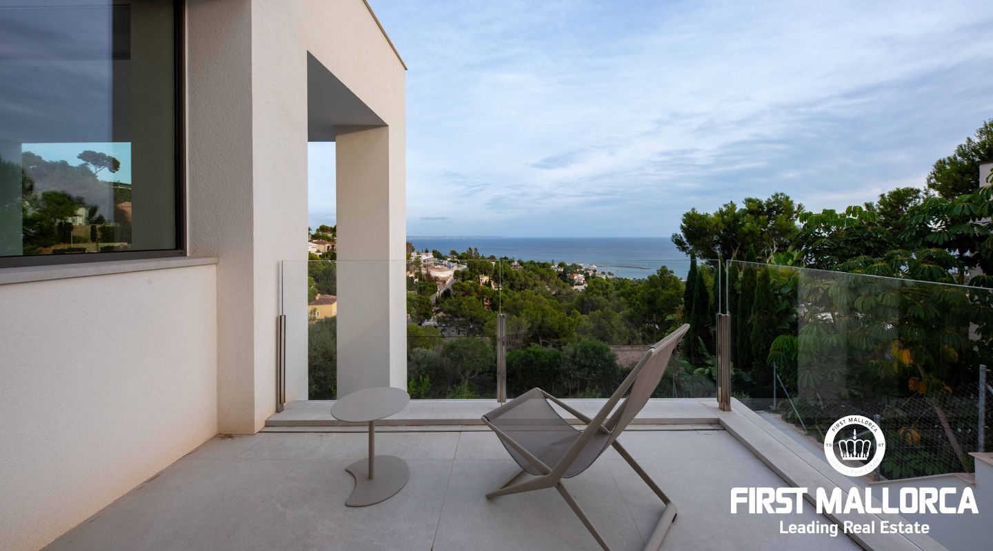 Denna moderna villa med havsutsikt ligger ovanför den lyxiga hamnen i Puerto Portals. Den har totalt 5 sovrum och 5 en-suite badrum och ett walk-in dressing room i det stora sovrummet. Bostadsytan är uppdelad på tre nivåer. På den övre nivån finns huvudentrén med 2 gästrum, fullt utrustade badrum med eget badrum. Hissen leder härifrån till den lägsta våningen. På mellannivån finns huvudköket med rymlig matsal, ett av vardagsrummen med öppen spis och gästtoalett. På nedre plan finns ett annat vardagsrum med direkt tillgång till poolen och ytterligare två gästrum med eget badrum. Ett rymligt loungeområde vid poolen med ett fullt utrustat utomhuskök avrundar Medelhavsstämningen perfekt. Från alla rum och terrasser har man en fantastisk utsikt över Medelhavet. Utrustningen inkluderar Poliform-garderober, ett Poliform-kök, Minotti-möbler, central luftkonditionering och golvvärme i hela huset. Sammanfattningsvis; det perfekta hemmet på Mallorca! Costa den Blanes är ett av de mest exklusiva bostadsområdena på sydvästra Mallorca. Omgivet av Puerto Portals marina, vackra sandstränder och internationella skolor, kan man njuta av Medelhavsklimatet här året runt i lugn och ro. Både öns huvudstad Palma ligger bara 15 minuter bort och flygplatsen kan nås på 25 minuter med bil.