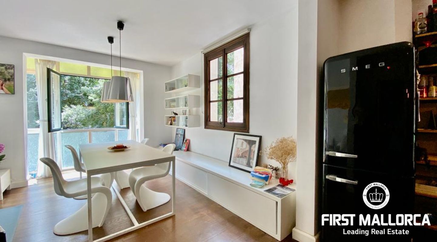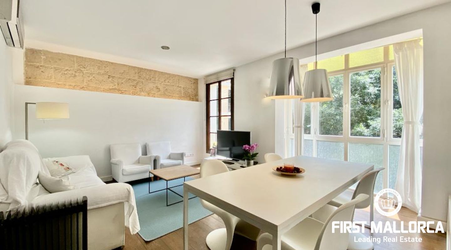 Denna rymliga lägenhet har gott om naturligt ljus, och vardagsrummet/matsalen erbjuder en vacker utsikt över ett av Palmas mest ikoniska torg, vilket skapar en unik och speciell atmosfär.