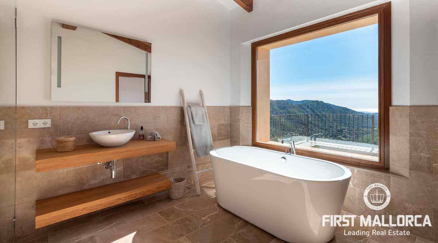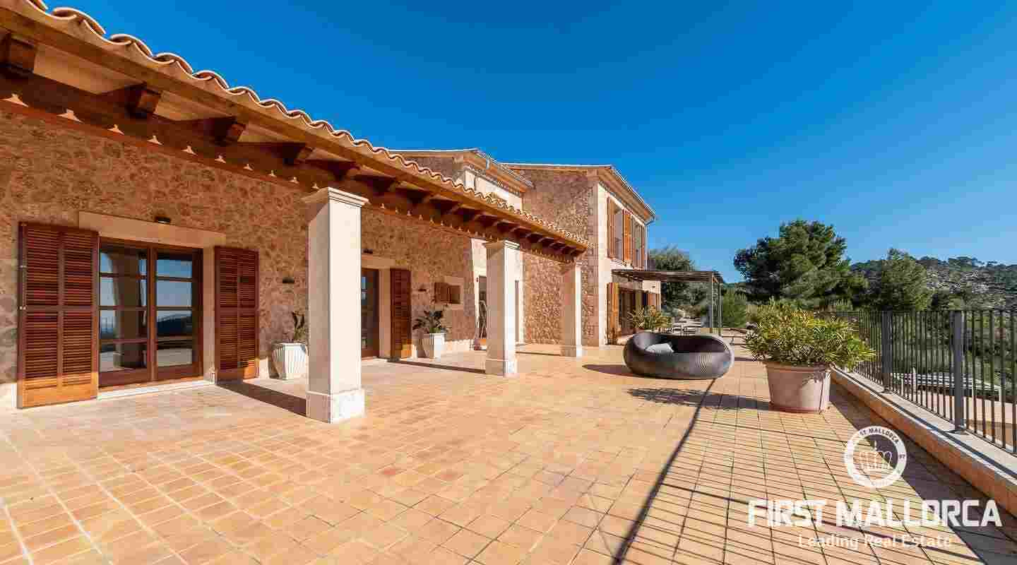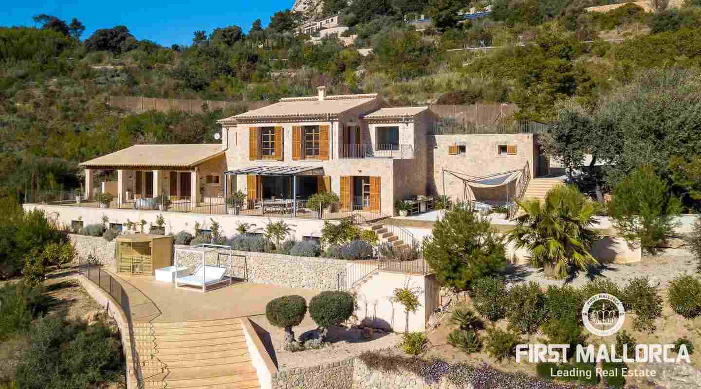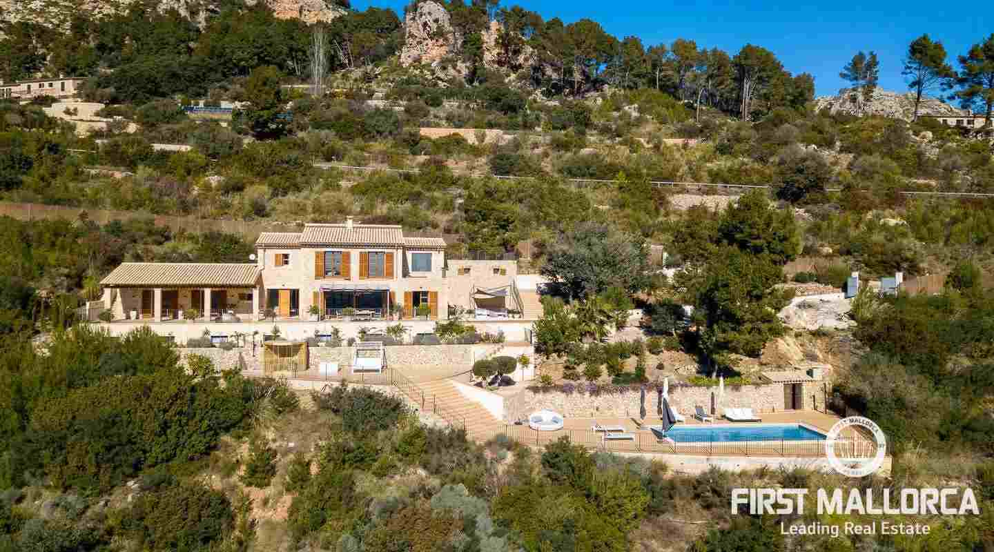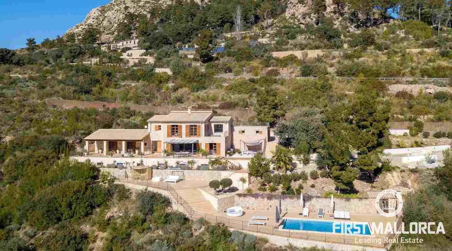 Bottenvåningen består av ett stort vardagsrum i öppen planlösning med matsal och kök med panoramafönster och direkt tillgång till terrassen. På denna våning finns också 2 rymliga sovrum med eget badrum och en gästtoalett. På denna nivå har alla rum direkt tillgång till den stora och delvis täckta terrassen och en inre uteplats. En trappa leder upp till första våningen, där du hittar det stora sovrummet med eget badrum med egen privat terrass och ytterligare ett sovrum med eget badrum. Dessutom erbjuder villan en enorm källare full av möjligheter. Den stora poolen är omgiven av flera terrasser, en lounge och en grillplats. På denna terrass kan du koppla av och njuta av medelhavsatmosfären och den sensationella panoramiska havs- och bergsutsikten. Denna fantastiska villa är idylliskt belägen på en stor tomt högt upp på ett berg i Andratx, dess sydliga orientering garanterar hela dagen sol på. Körningen till villan är en av de bästa på ön med breda vägar och imponerande utsikt hela vägen från Andratx.
