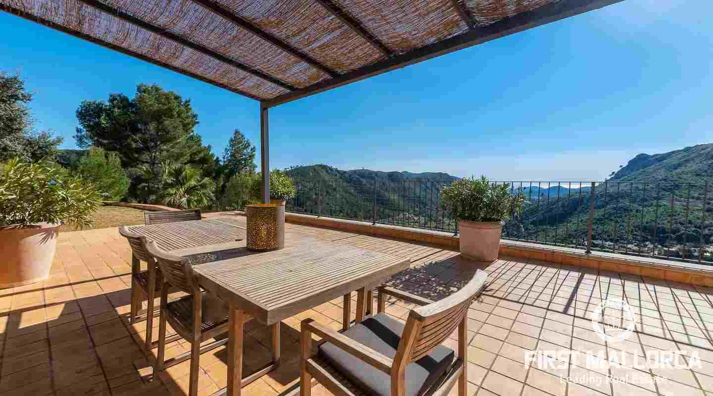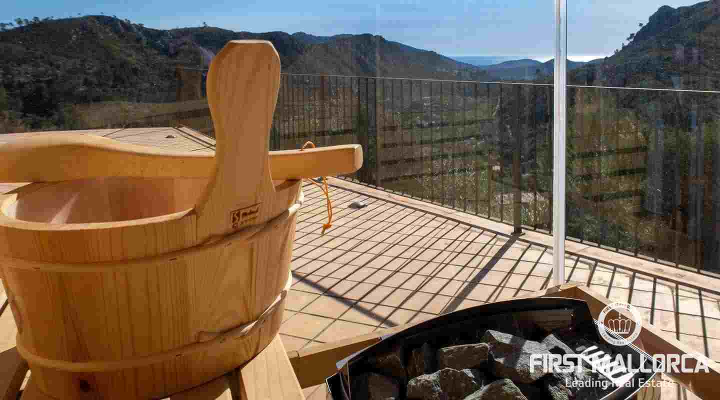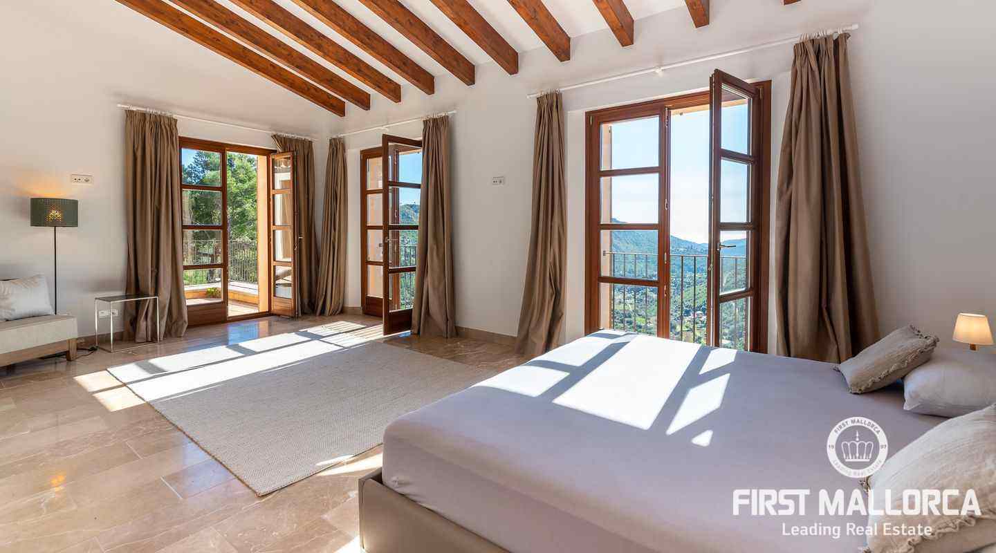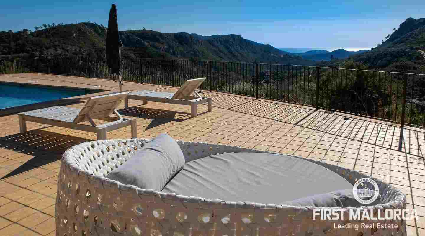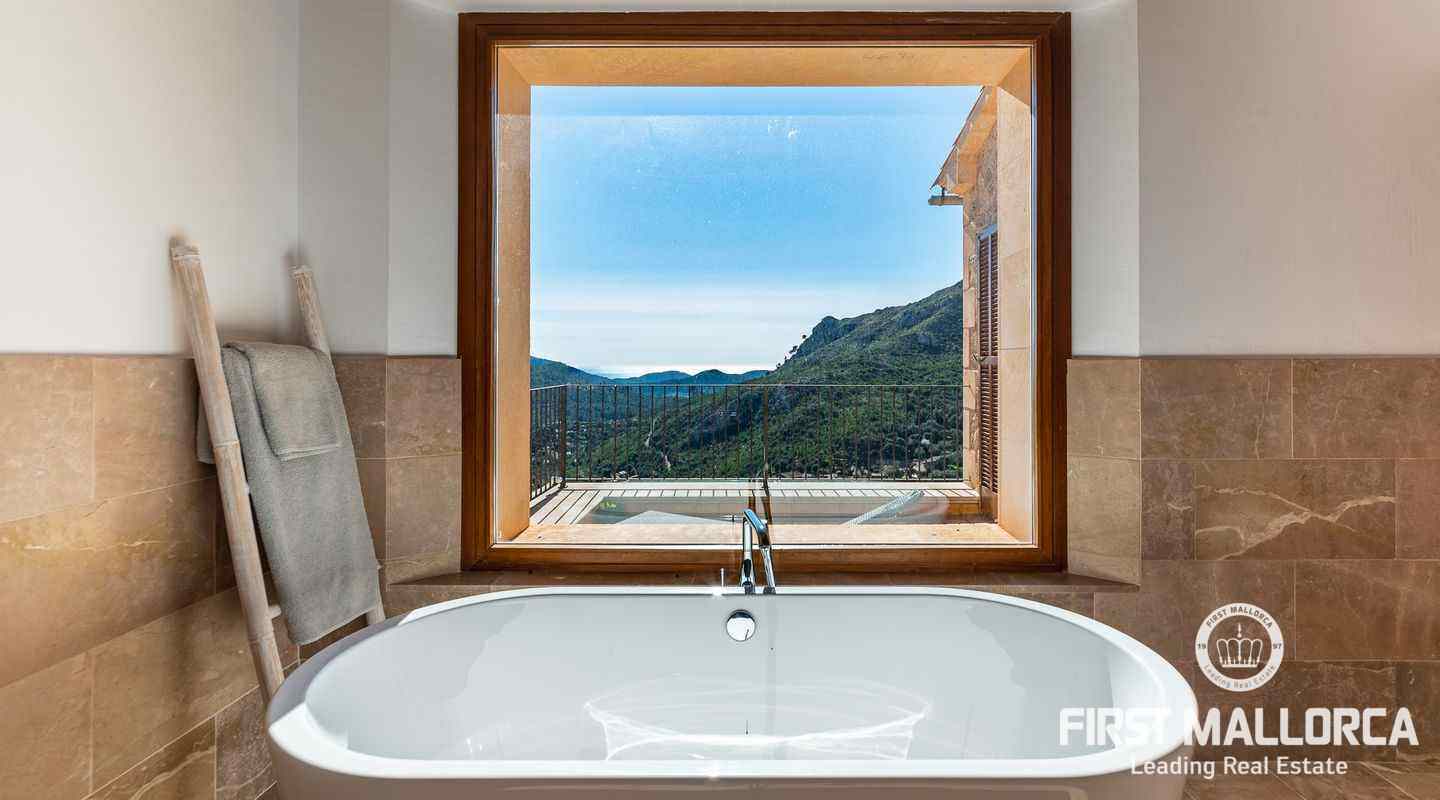 Bottenvåningen består av ett stort vardagsrum i öppen planlösning med matsal och kök med panoramafönster och direkt tillgång till terrassen. På denna våning finns också 2 rymliga sovrum med eget badrum och en gästtoalett. På denna nivå har alla rum direkt tillgång till den stora och delvis täckta terrassen och en inre uteplats. En trappa leder upp till första våningen, där du hittar det stora sovrummet med eget badrum med egen privat terrass och ytterligare ett sovrum med eget badrum. Dessutom erbjuder villan en enorm källare full av möjligheter. Den stora poolen är omgiven av flera terrasser, en lounge och en grillplats. På denna terrass kan du koppla av och njuta av medelhavsatmosfären och den sensationella panoramiska havs- och bergsutsikten. Denna fantastiska villa är idylliskt belägen på en stor tomt högt upp på ett berg i Andratx, dess sydliga orientering garanterar hela dagen sol på. Körningen till villan är en av de bästa på ön med breda vägar och imponerande utsikt hela vägen från Andratx.