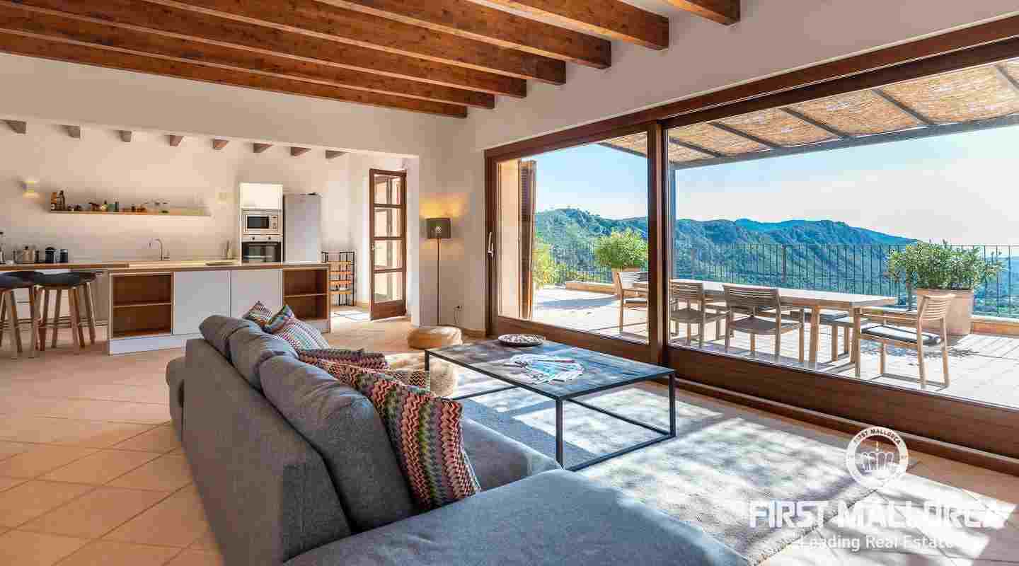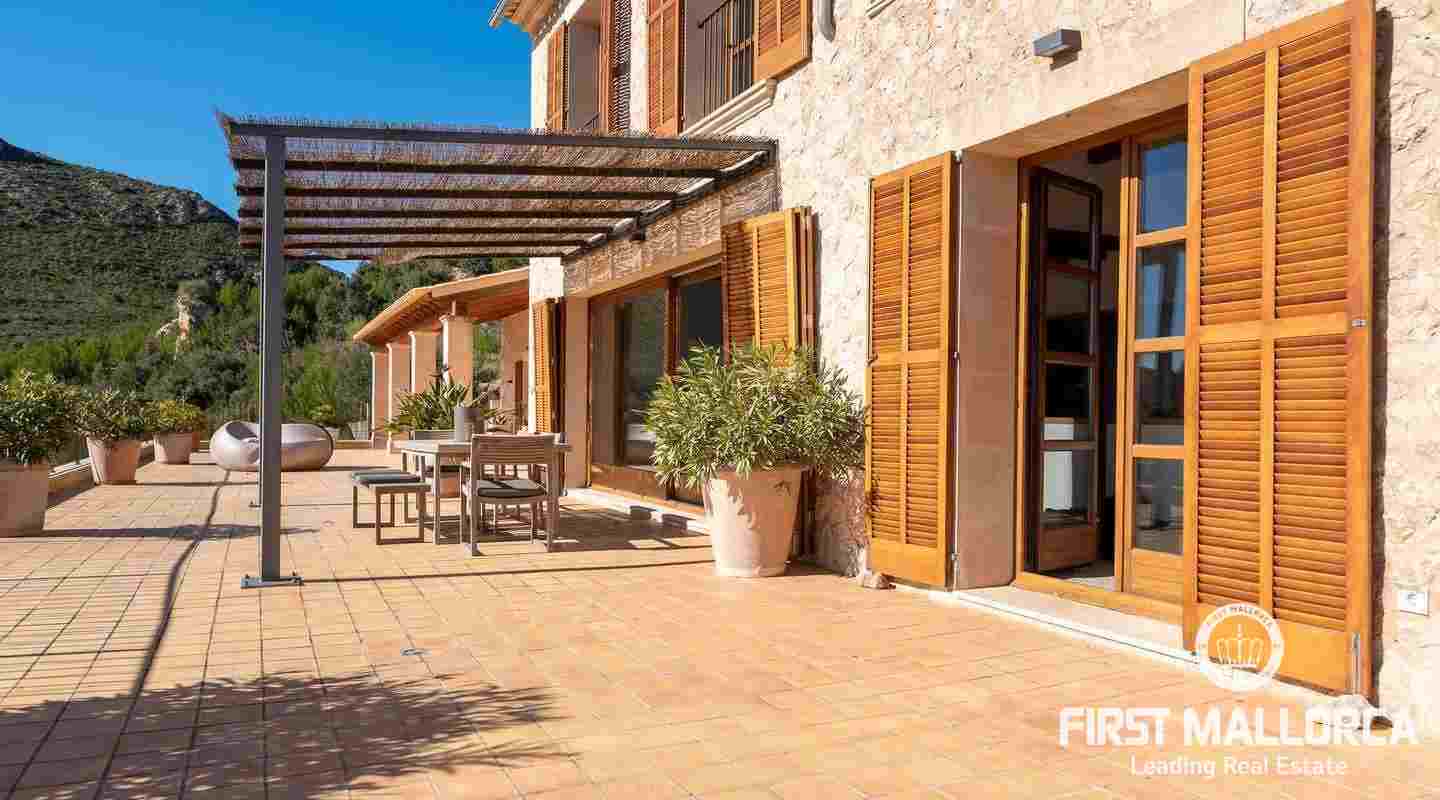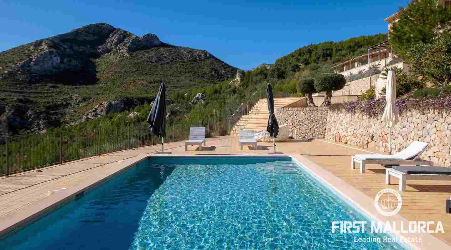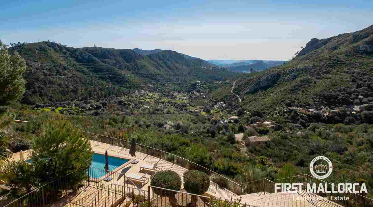 Bottenvåningen består av ett stort vardagsrum i öppen planlösning med matsal och kök med panoramafönster och direkt tillgång till terrassen. På denna våning finns också 2 rymliga sovrum med eget badrum och en gästtoalett. På denna nivå har alla rum direkt tillgång till den stora och delvis täckta terrassen och en inre uteplats. En trappa leder upp till första våningen, där du hittar det stora sovrummet med eget badrum med egen privat terrass och ytterligare ett sovrum med eget badrum. Dessutom erbjuder villan en enorm källare full av möjligheter. Den stora poolen är omgiven av flera terrasser, en lounge och en grillplats. På denna terrass kan du koppla av och njuta av medelhavsatmosfären och den sensationella panoramiska havs- och bergsutsikten. Denna fantastiska villa är idylliskt belägen på en stor tomt högt upp på ett berg i Andratx, dess sydliga orientering garanterar hela dagen sol på. Körningen till villan är en av de bästa på ön med breda vägar och imponerande utsikt hela vägen från Andratx.