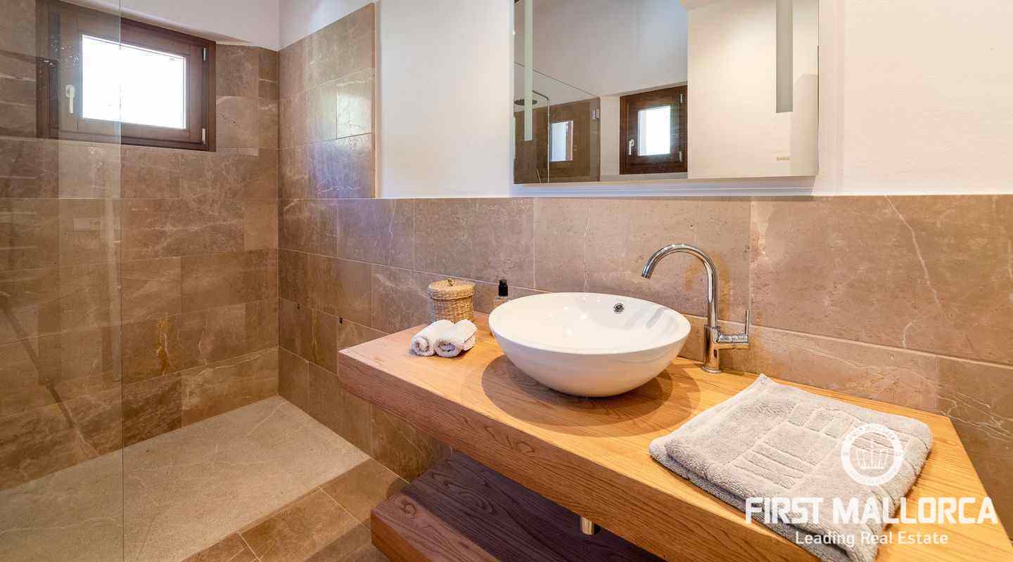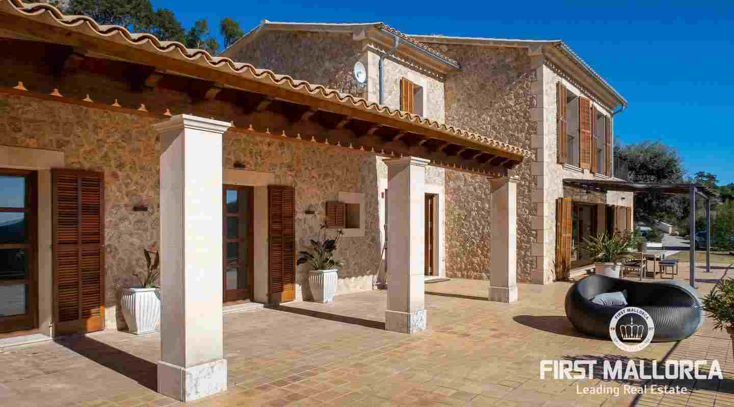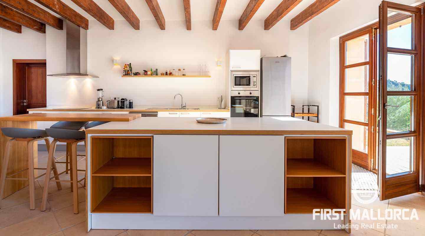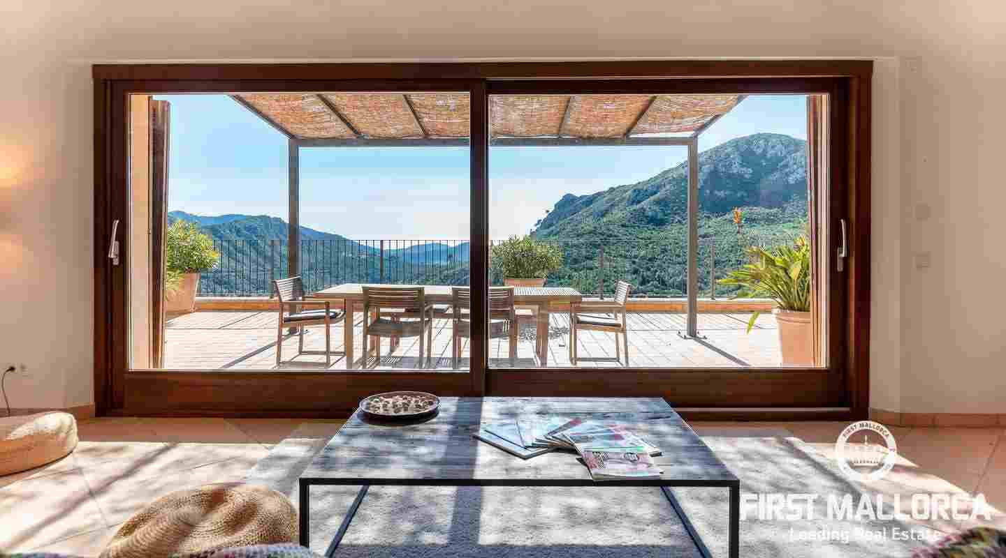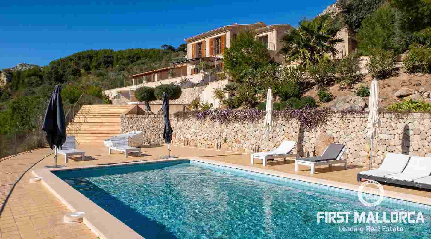 Bottenvåningen består av ett stort vardagsrum i öppen planlösning med matsal och kök med panoramafönster och direkt tillgång till terrassen. På denna våning finns också 2 rymliga sovrum med eget badrum och en gästtoalett. På denna nivå har alla rum direkt tillgång till den stora och delvis täckta terrassen och en inre uteplats. En trappa leder upp till första våningen, där du hittar det stora sovrummet med eget badrum med egen privat terrass och ytterligare ett sovrum med eget badrum. Dessutom erbjuder villan en enorm källare full av möjligheter. Den stora poolen är omgiven av flera terrasser, en lounge och en grillplats. På denna terrass kan du koppla av och njuta av medelhavsatmosfären och den sensationella panoramiska havs- och bergsutsikten. Denna fantastiska villa är idylliskt belägen på en stor tomt högt upp på ett berg i Andratx, dess sydliga orientering garanterar hela dagen sol på. Körningen till villan är en av de bästa på ön med breda vägar och imponerande utsikt hela vägen från Andratx.