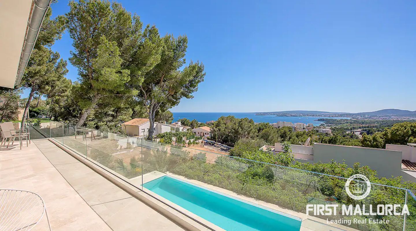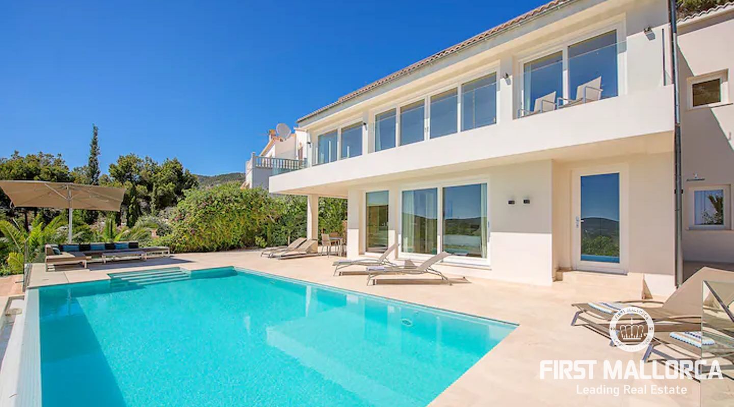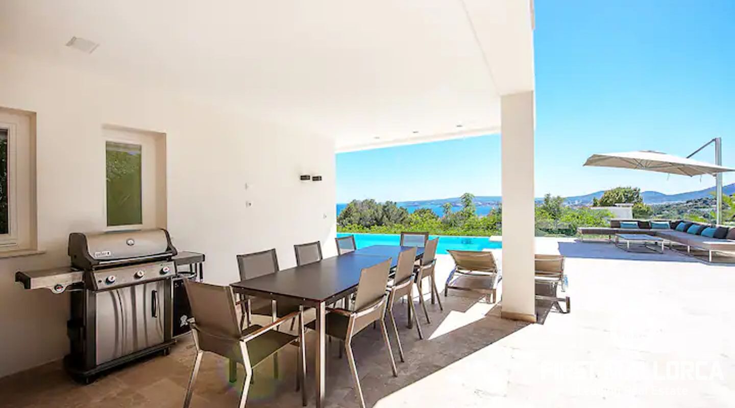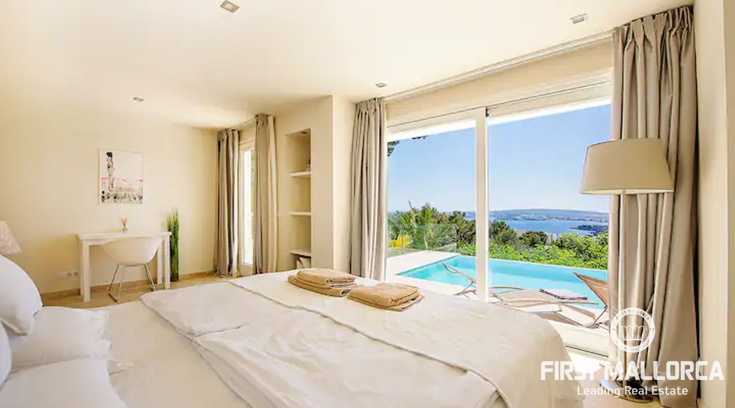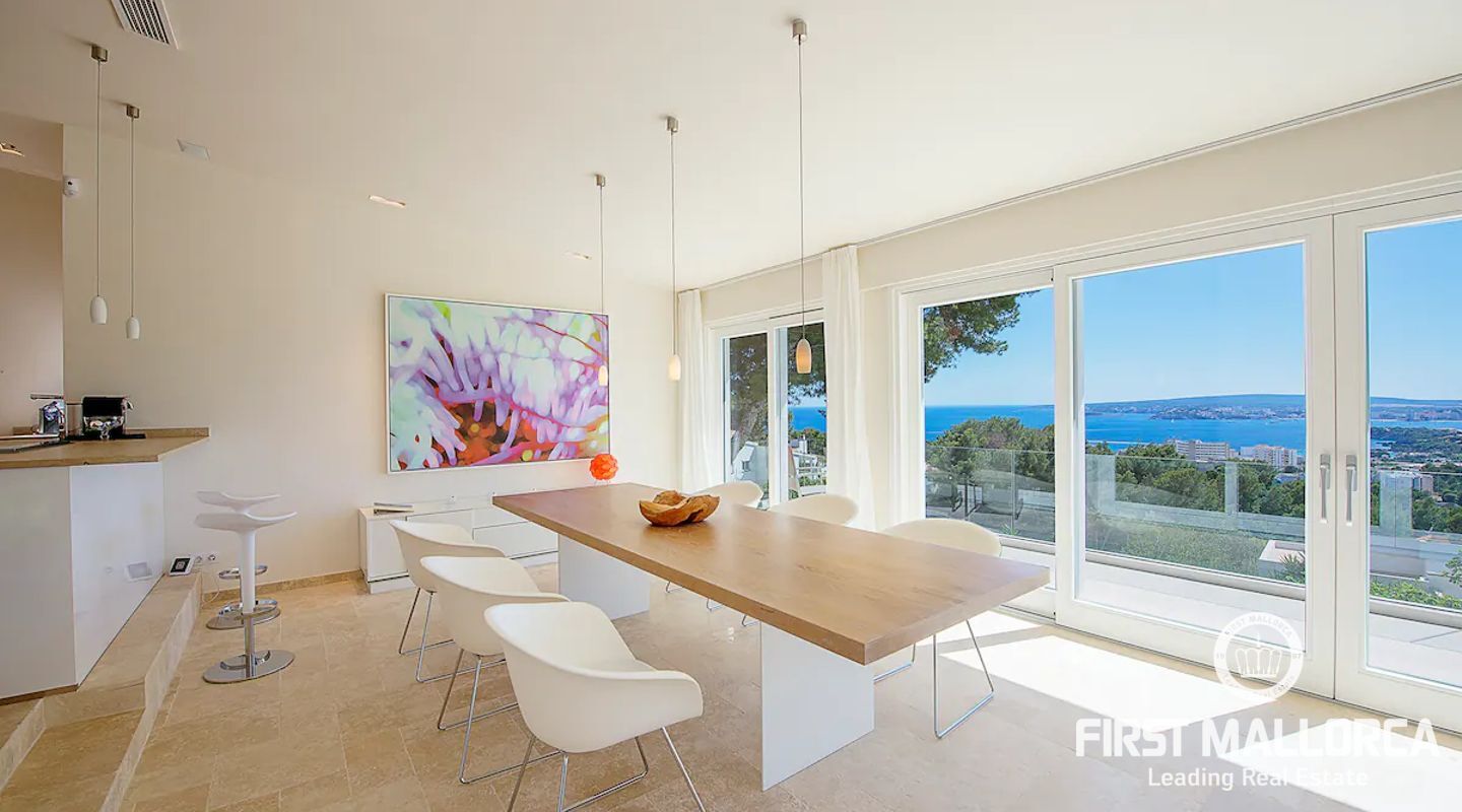 Modern, ljus och rymlig villa på en av de mest eftertraktade platserna på Mallorca. Villan har en stor terrass med pool och en täckt terrass med utekök + Weber-grill. Alla rum har golvvärme och luftkonditionering. Höghastighetsinternet, WLAN och Sonos radio / musiksystem Det finns också många shopping- och matställen i Portals Nous centrum. Huset ligger på en kulle. Palma ligger 10 minuter bort och flygplatsen kan nås på 20 minuter