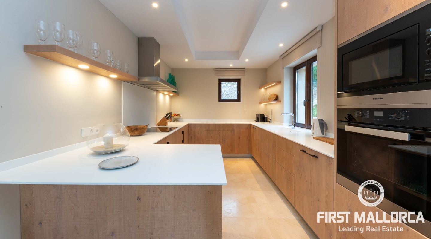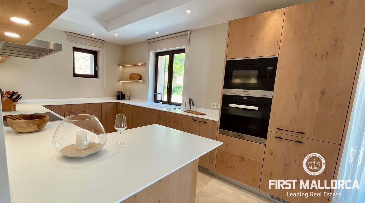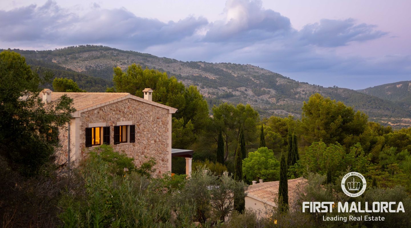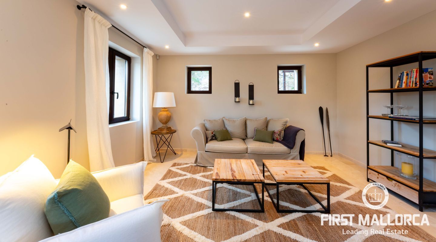 Med över 6 000 m² mark och en villa på mer än 300 m² fördelad på två våningar erbjuder fastigheten rymliga och ljusa ytor. Det moderna vardagsrummet i öppen planlösning förenar köket med köksö, matsalen och det mysiga vardagsrummet på ett sömlöst sätt. En miljö som kombinerar Mallorcas rustika själ med modern komfort och estetik.