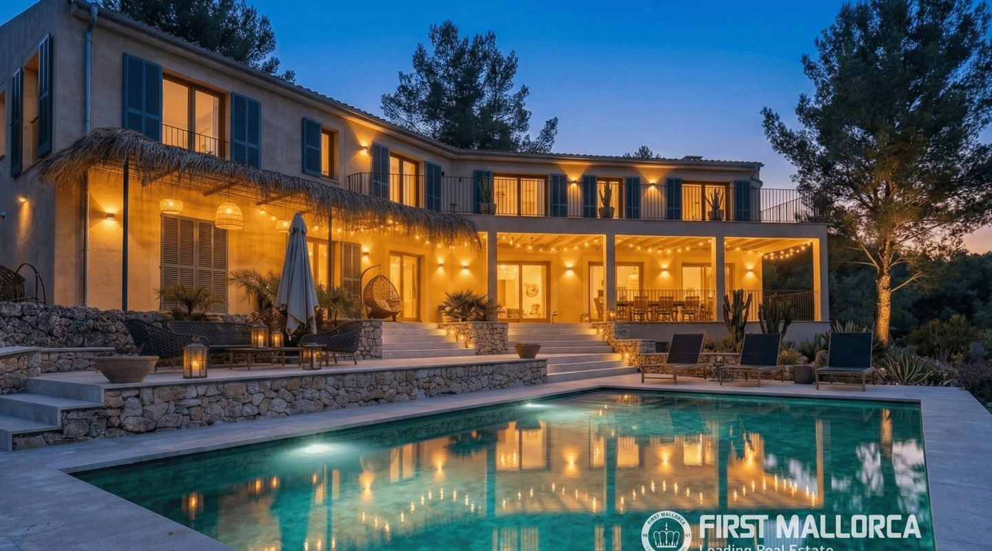 När natten faller förvandlar den noggrant utformade stämningsbelysningen med varma ljus, lyktor och girlanger fasaden och terrasserna till en magisk och extremt välkomnande miljö. Hela detta paradis är inramat av mogna tallar och frodig inhemsk vegetation som garanterar absolut integritet utan att ge avkall på skönheten i de öppna omgivningarna. Denna finca representerar en oöverträffad fastighetsmöjlighet för dem som söker en högklassig bostad, som kombinerar exklusivitet,