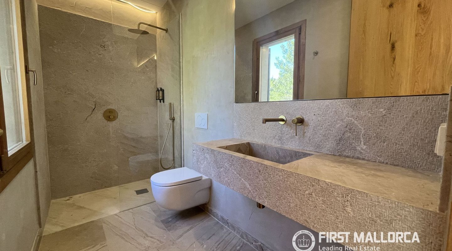 Fincans exteriör är ett verkligt visuellt mästerverk, designat för att göra det mesta av Mallorcas exceptionella klimat och skapa oförglömliga minnen. Hjärtat i detta utrymme är dess fantastiska smaragdtonade pool, som är omgiven av ett elegant solarium och spektakulära terrasserade områden. Dessa olika nivåer smälter harmoniskt in i landskapet tack vare sina vackra murar av mallorkinsk natursten. Utomhusutrymmena inbjuder ständigt till avkoppling och erbjuder en mysig loungeavdelning under ett charmigt tak i rustik stil och en stor täckt veranda som är den idealiska platsen att njuta av långa sommarmiddagar.